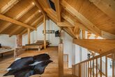 Der Galeriebereich dient als Wohn- Schlafzimmer. Er wurde mit eine große Ledercouch eines Italienischen Designer, sowie ein TV- Bereich und ein Doppelbett aus Altholz möbliert.