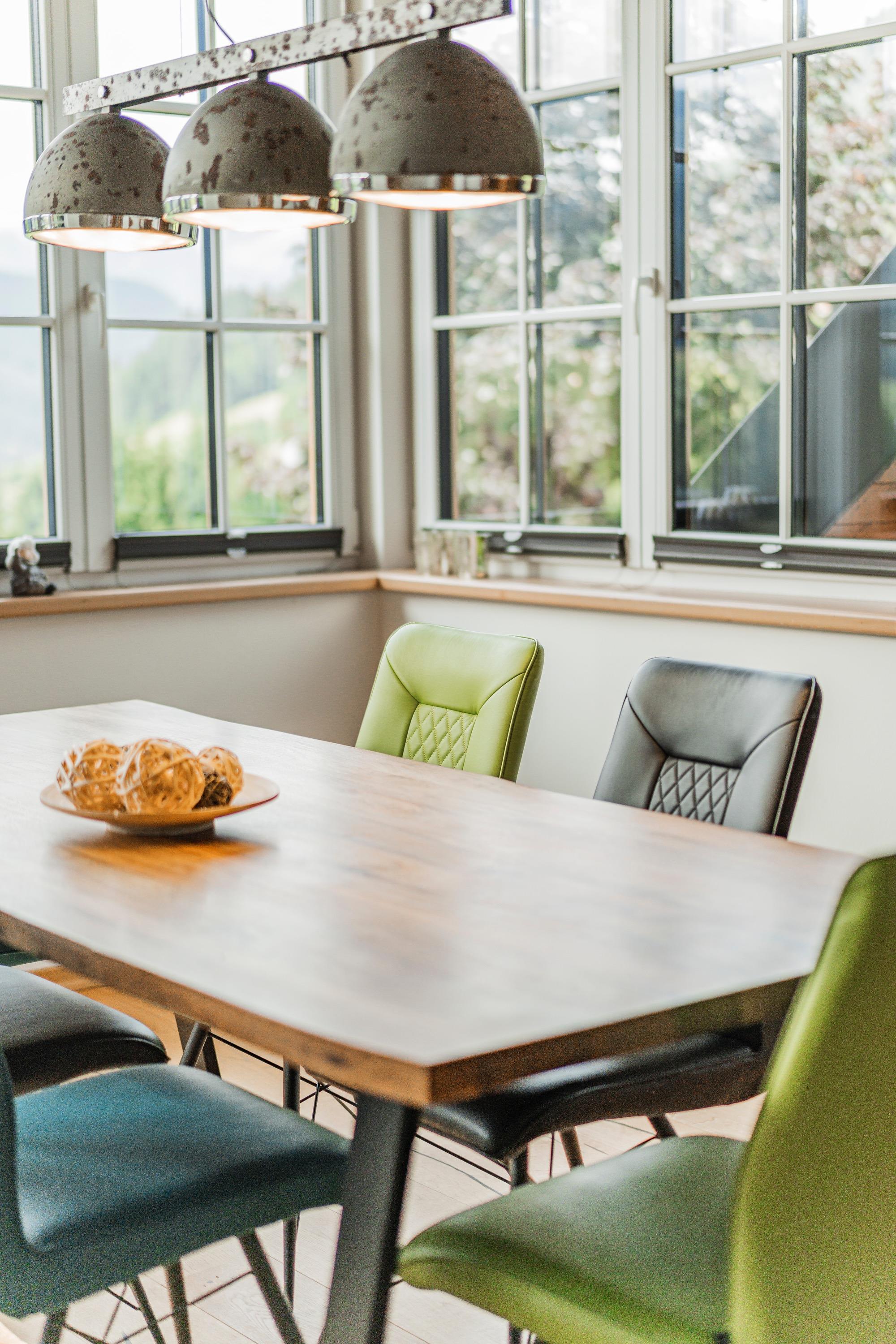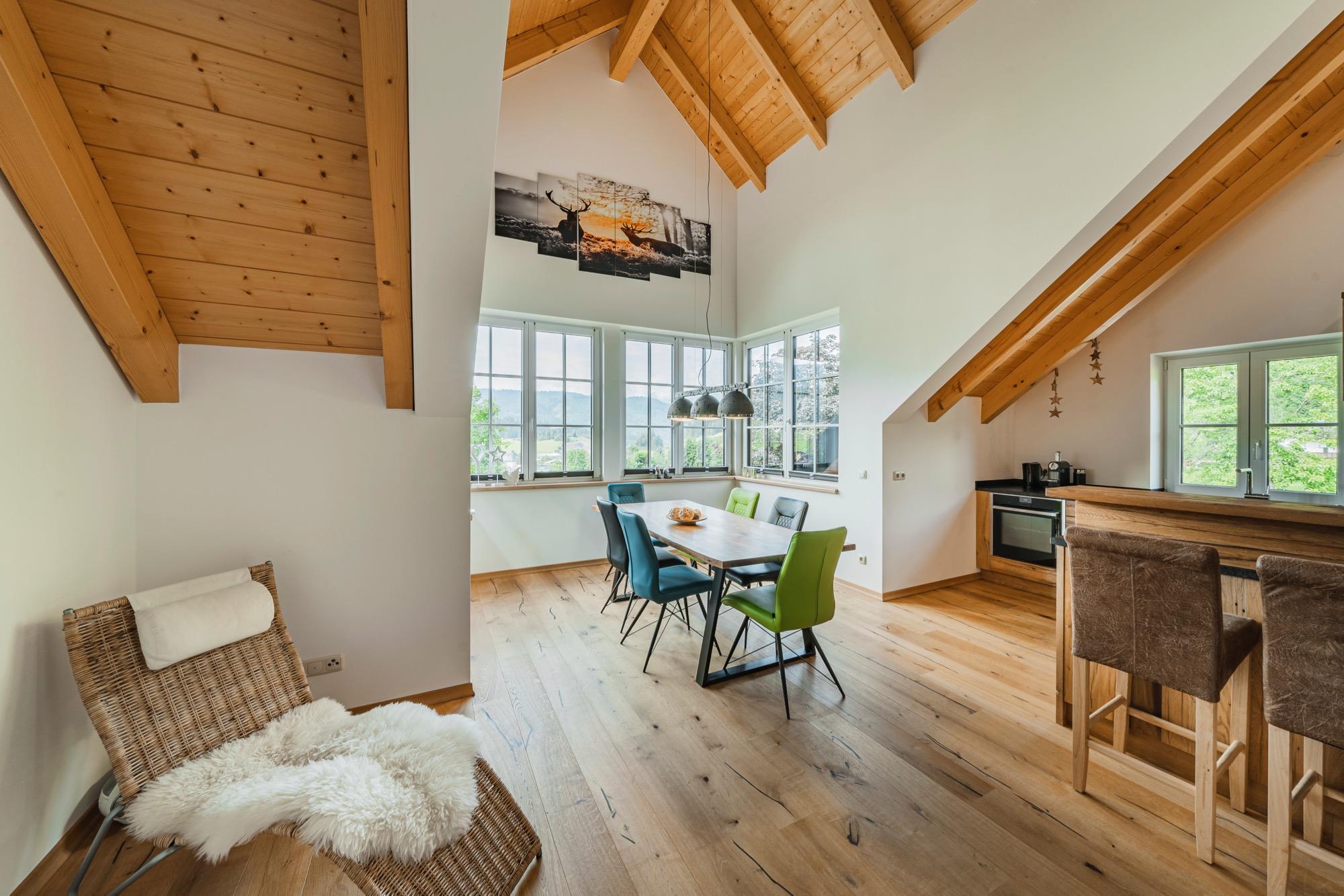 Die Wohnung selbst besticht nicht nur durch die herrliche Aussicht, sondern auch durch die einzigartige innenarchitektonische Gestaltung. Wir bieten Ihnen einen großen und offen gestalteten Wohnbereich bestehend aus Wohnküche welche mittels Treppe mit der Galerie offen verbunden ist. Auch die verglaste Veranda ist Teil der Wohnküche. Darin befindet sich der Essbereich.