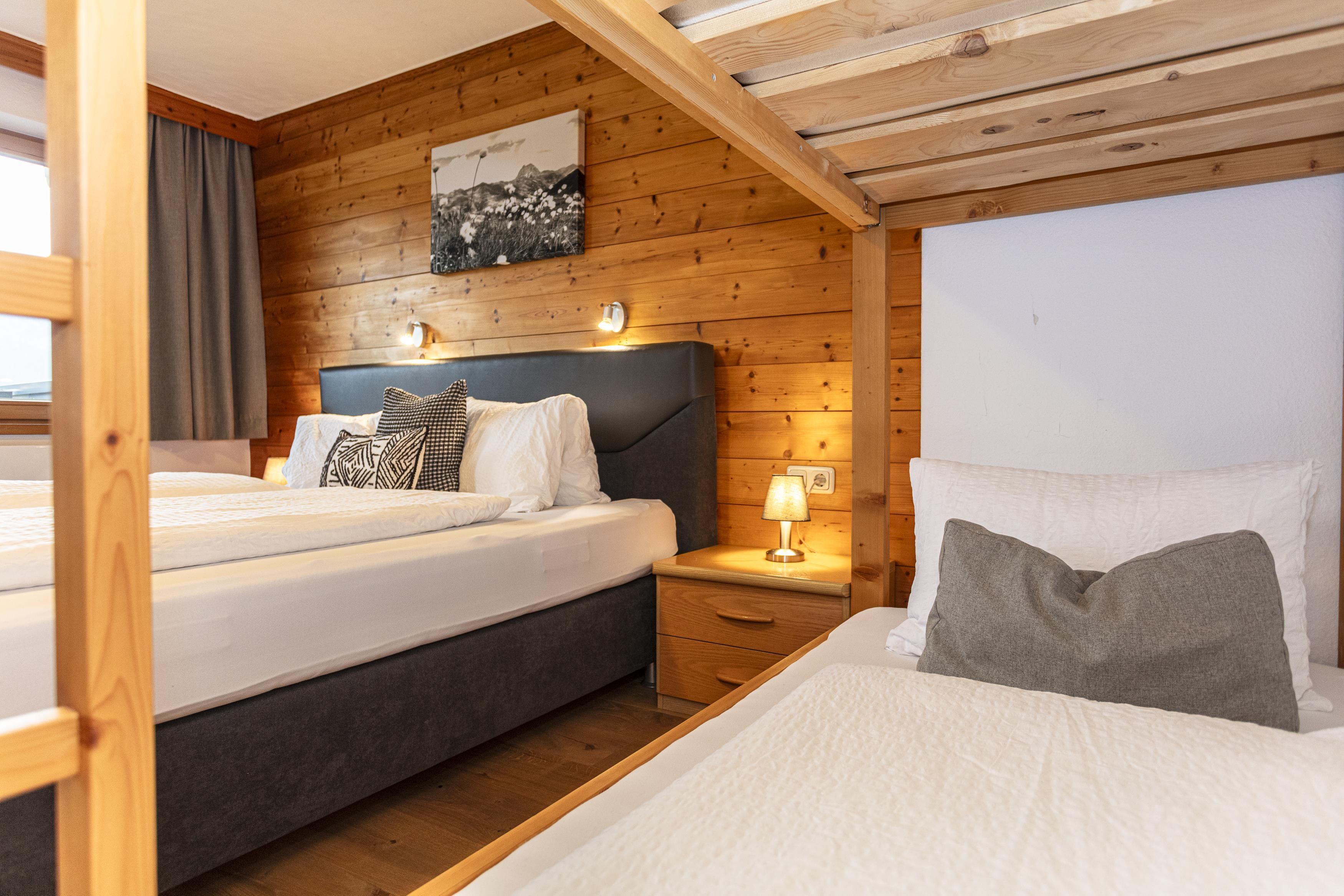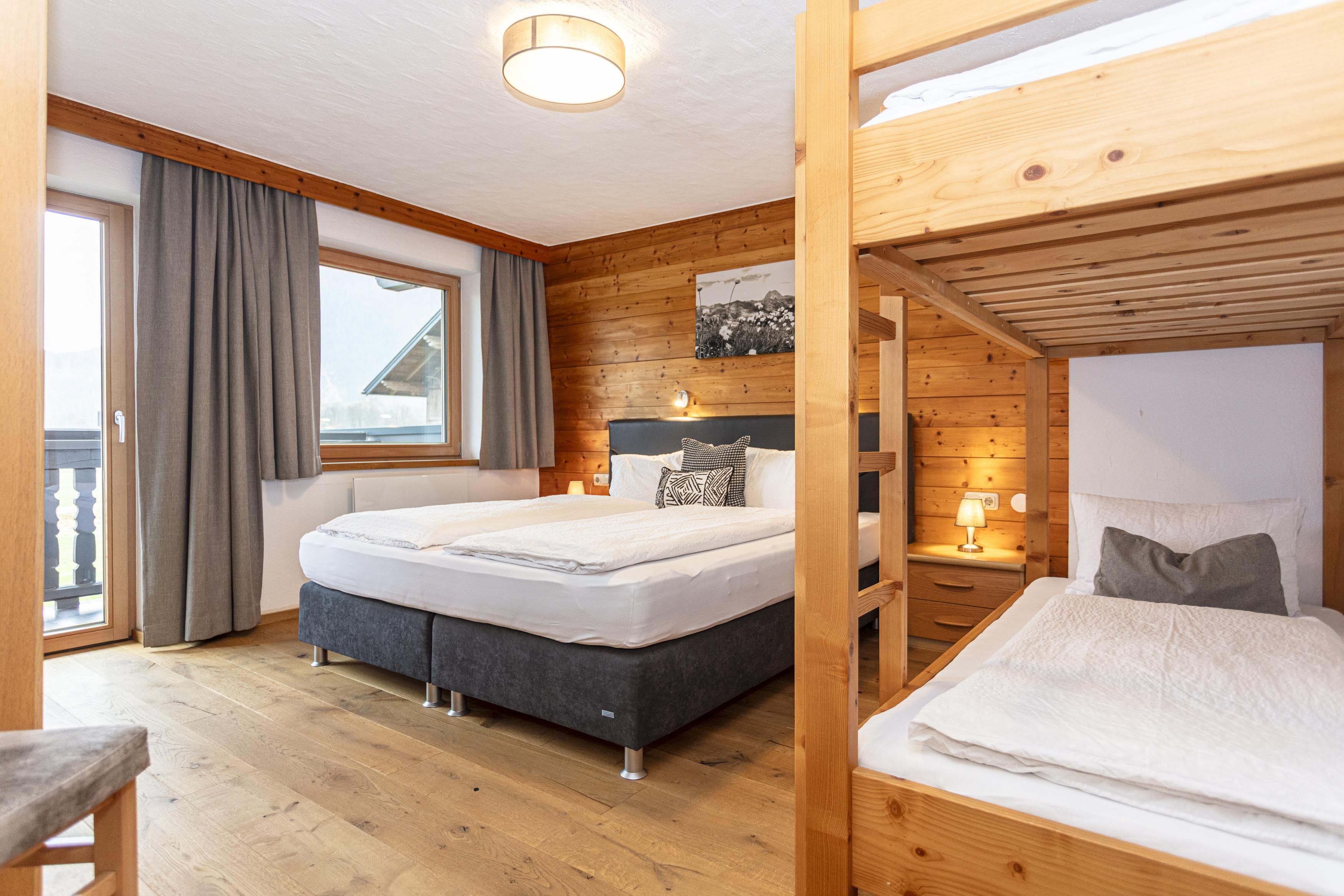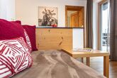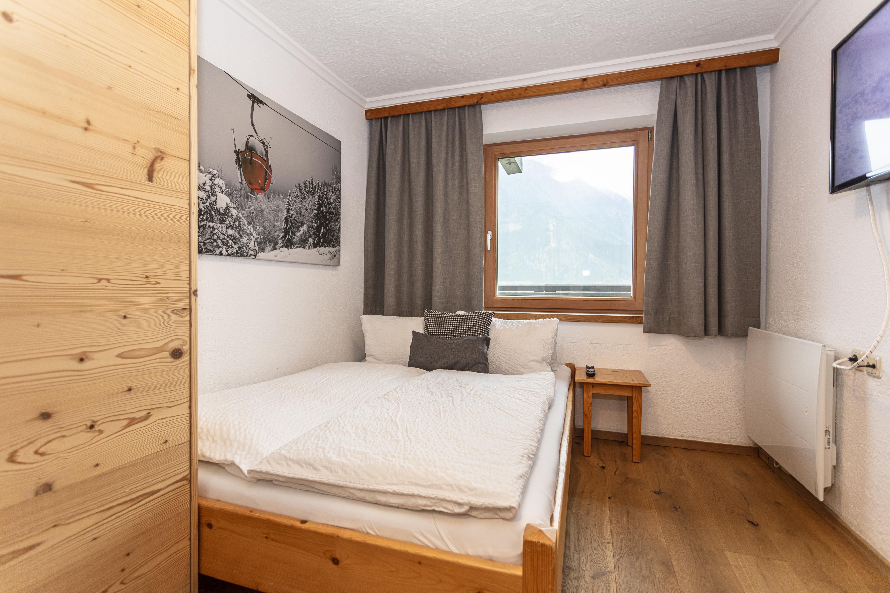 Schlafzimmer mit Doppel- und Etagenbett, Schlafzimmer mit franz. Bett (1,40m breit), Wohn- und Essraum mit Küche, modernes Bad mit Dusche und WC, großzügige Sonnenterrasse mit traumhaftem Bergblick