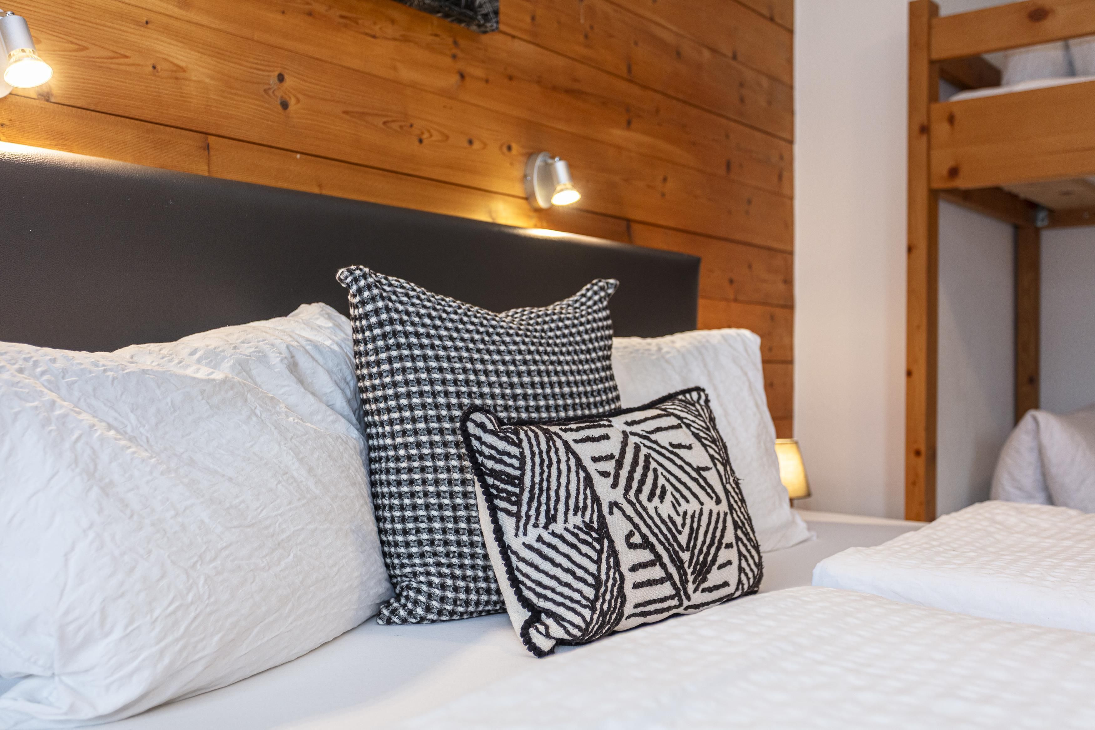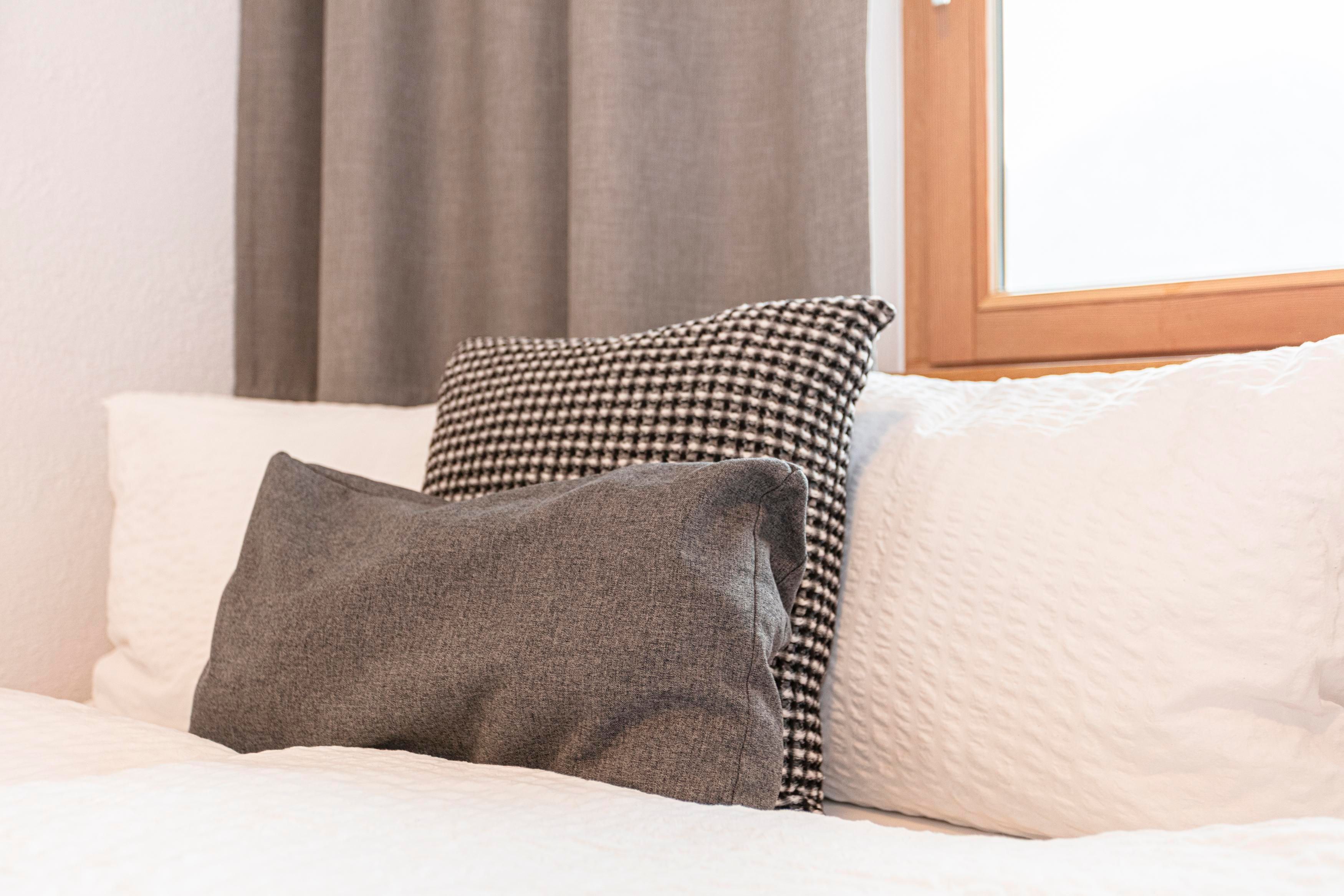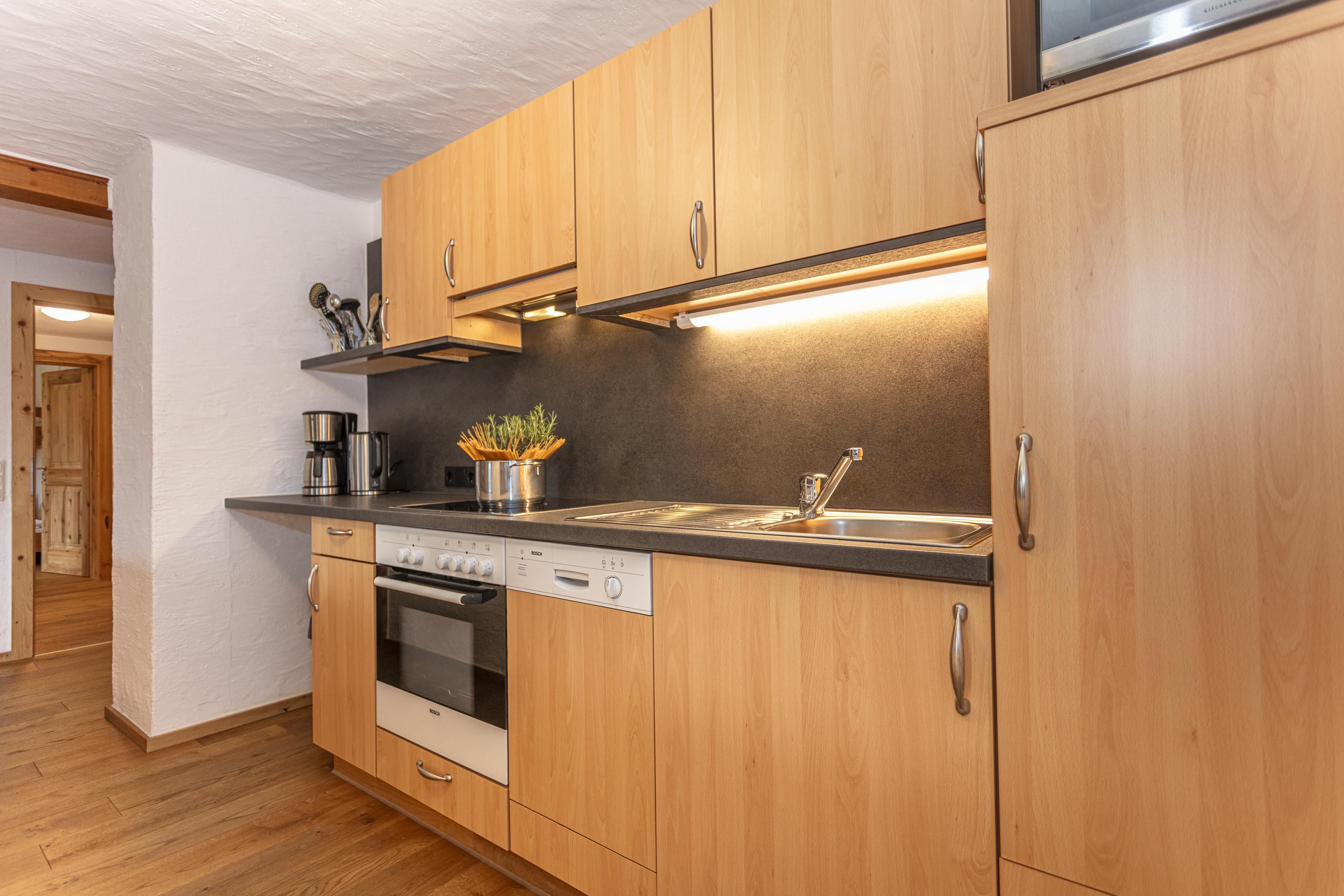 Schlafzimmer mit Doppel- und Etagenbett, Schlafzimmer mit franz. Bett (1,40m breit), Wohn- und Essraum mit Küche, modernes Bad mit Dusche und WC, großzügige Sonnenterrasse mit traumhaftem Bergblick