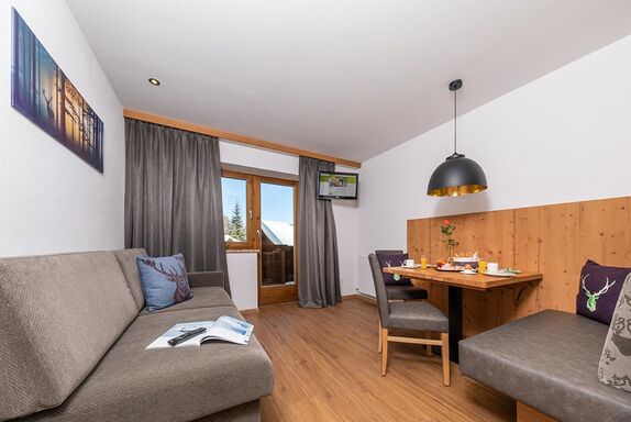 Das Appartement Bergleut befindet sich im 2. Stock mit Blick auf den Bernkogel, Balkon mit Morgensonne. Es verfügt über ein Schlafzimmer mit Doppelbett und einer Schlafcouch, einem Wohnzimmer mit gemütlicher Sitzecke mit Esstisch und Couch, vollausgestattete Küchenzeile inkl. Geschirrspüler, Mikrowelle, Kaffeemaschine, Kühlschrank, Wasserkocher…