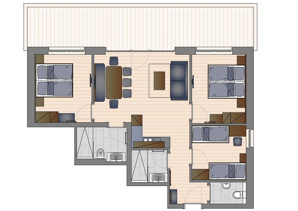 Das Appartement Freiraum befindet sich ruhig gelegen im 2. Stock mit großer Terrasse, Blick auf den Hochkeil. Es verfügt über einen Vorraum, drei getrennte Schlafzimmer mit 2 Doppelbetten und 2 Einzelbetten, einem Wohnzimmer mit gemütlicher Sitzecke mit Esstisch und ausziehbarer Schlafcouch, vollausgestattete Küche inkl. Geschirrspüler, Mikrowelle, Kaffeemaschine, Kühlschrank, Wasserkocher…