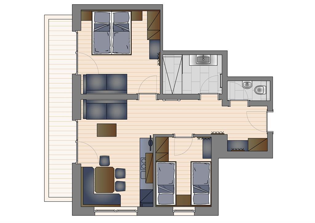 Das Appartement Weitblick befindet sich im 2. Stock mit Balkon, Blick auf den Schneeberg. Es verfügt über einen Vorraum, zwei getrennte Schlafzimmer mit 2 Doppelbetten und ein mal mit einer Schlafcouch, einem Wohnzimmer mit gemütlicher Sitzecke mit Esstisch und hochwertiger ausziehbarer Schlafcouch, vollausgestattete Küche inkl. Geschirrspüler, Mikrowelle, Kaffeemaschine, Kühlschrank, Wasserkocher…