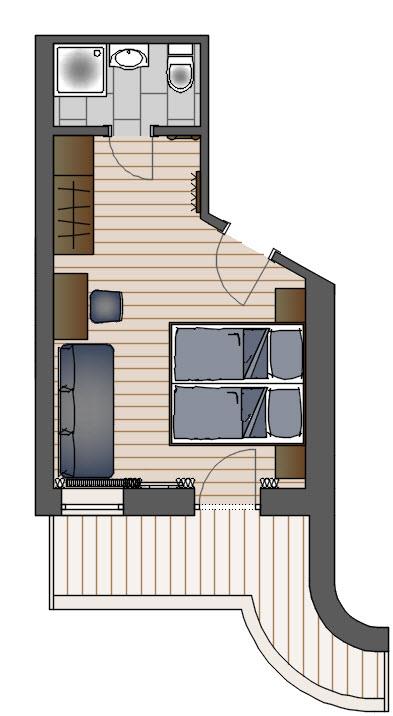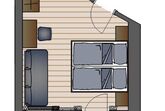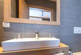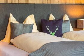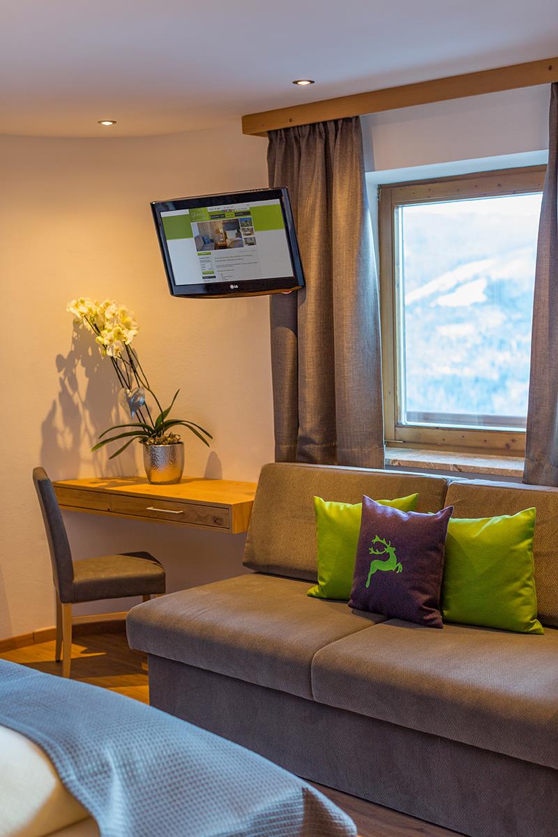 Das moderne Doppelzimmer im alpinen Stil für 1 bis 3 Personen befindet sich im 1. Stock, verfügt über ein Doppelbett (trennbar) mit offenem Fußende und hochwertiger Couch (Zusatzbett), TV, Dusche/WC und Balkon mit Blick auf den Bernkogel.