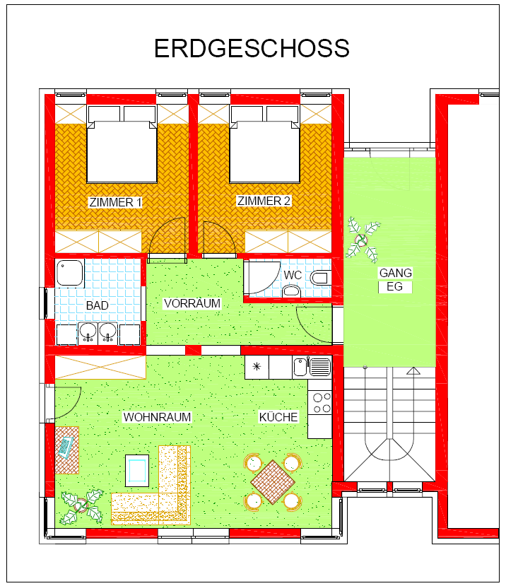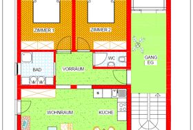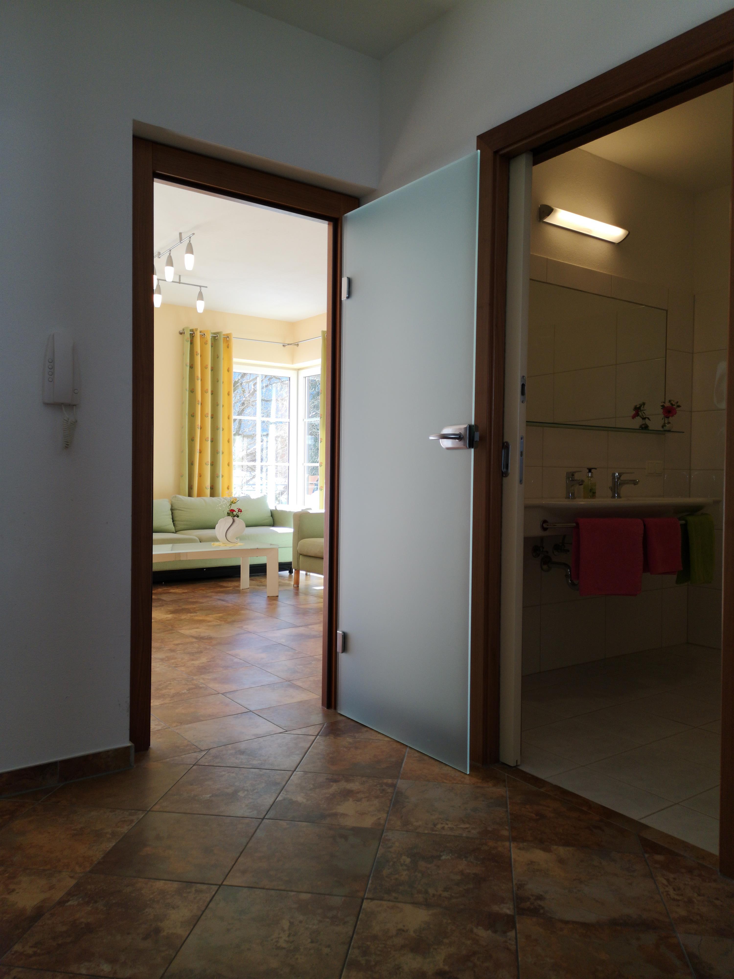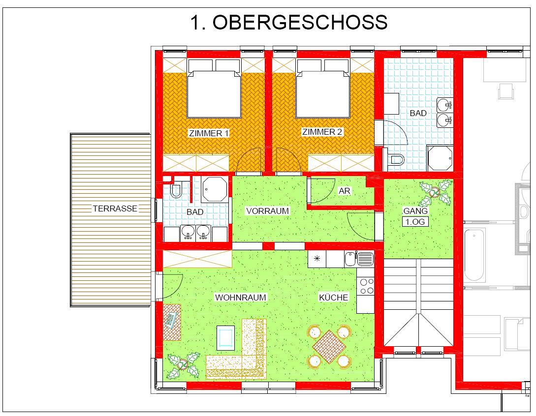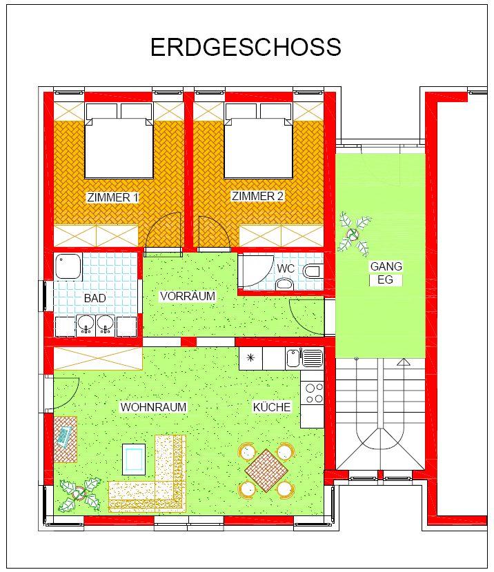 Das großzügige Appartement mit seinen 75 m² Wohnfläche erschließt sich über einen komfortablen Vorraum einerseits hin zum Wohn-/Essbereich mit vorgelagerter Terrasse sowie andereseits zu den beiden separaten Schlafbereichen mit dem vorgelagerten Bad.