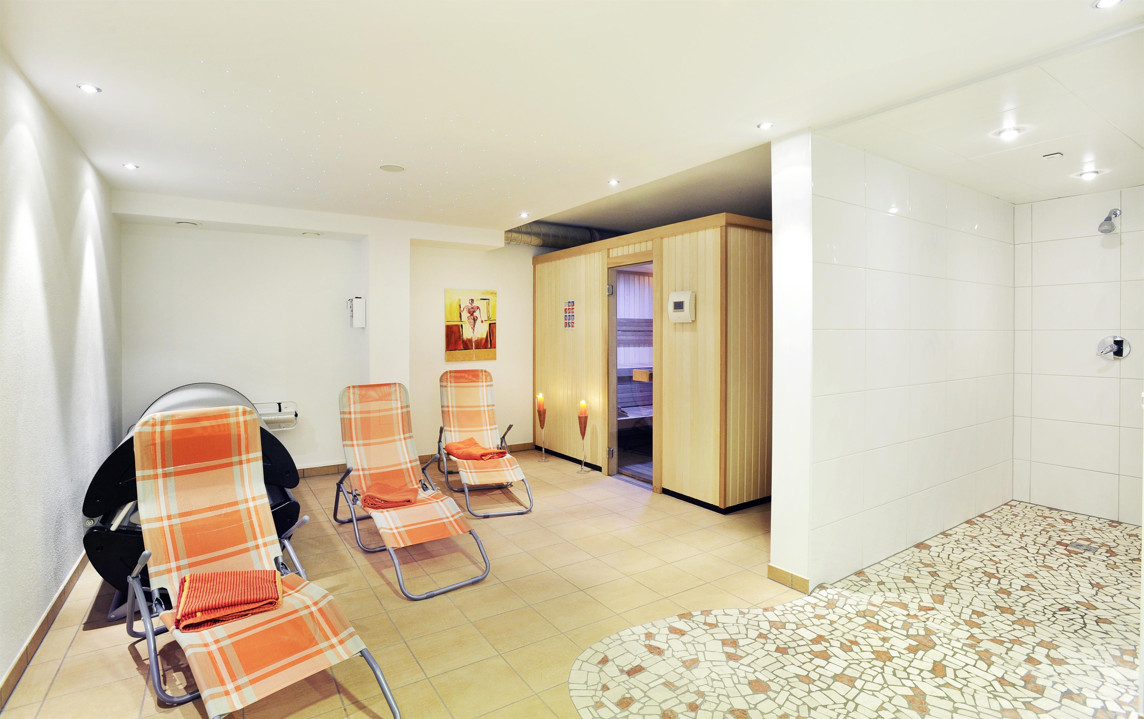 Der hauseigene Wellnessbereich mit Sauna und Solarium sowie Erlebnisduschen ist gegen einen kleinen Aufpreis nutzbar.