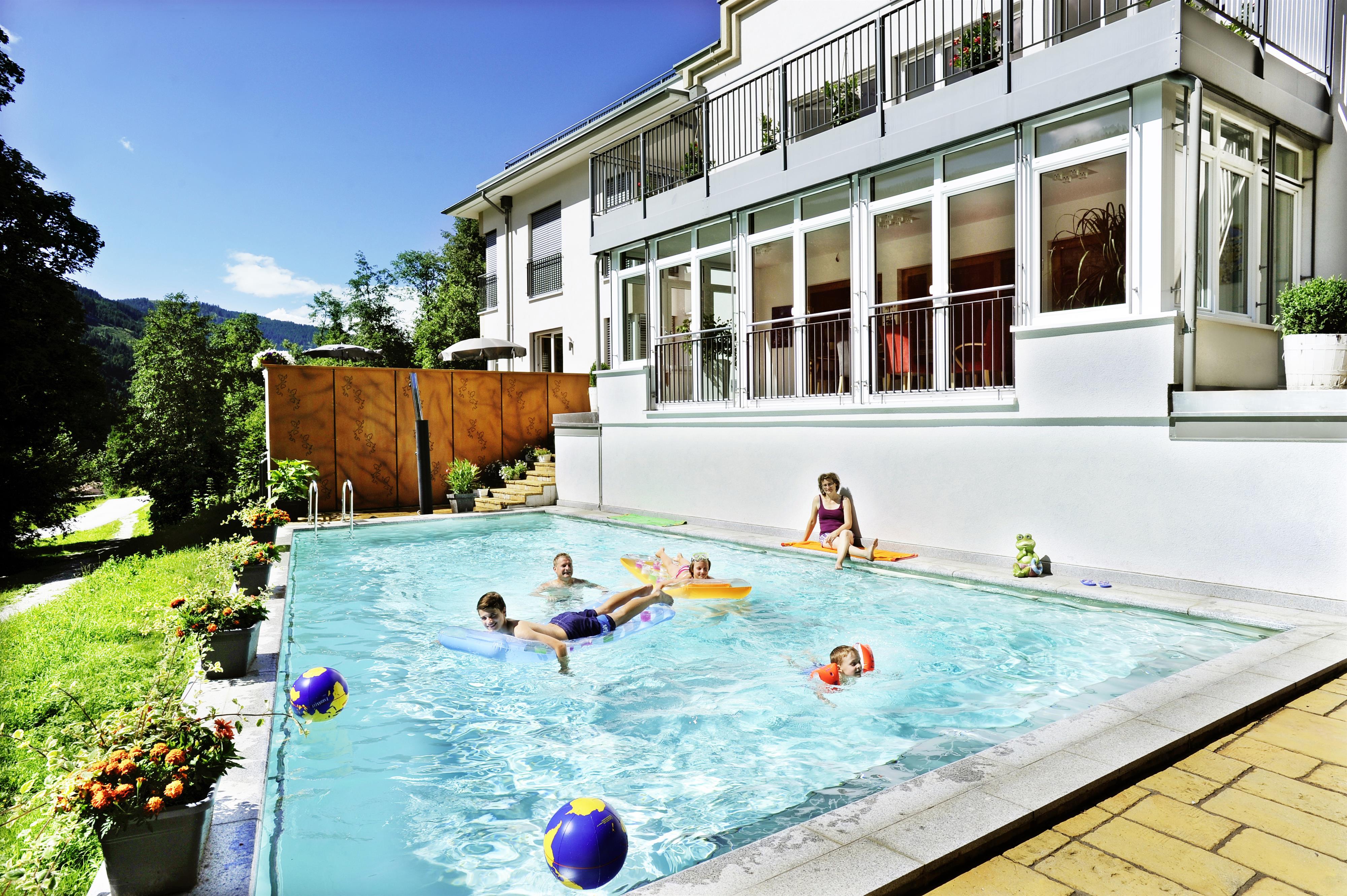 Im Sommer ist die Terrasse gleichzeitig Sonnendeck und vorgelagerter Bereich zum hauseigenen Swimming-Pool.