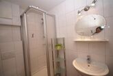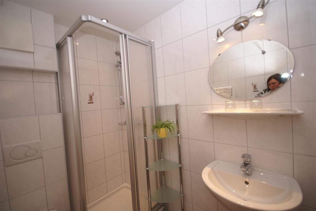 Bad mit Dusche, WC, Waschbecken und Haarfön, Dusch und Handtücher sind vorhanden.