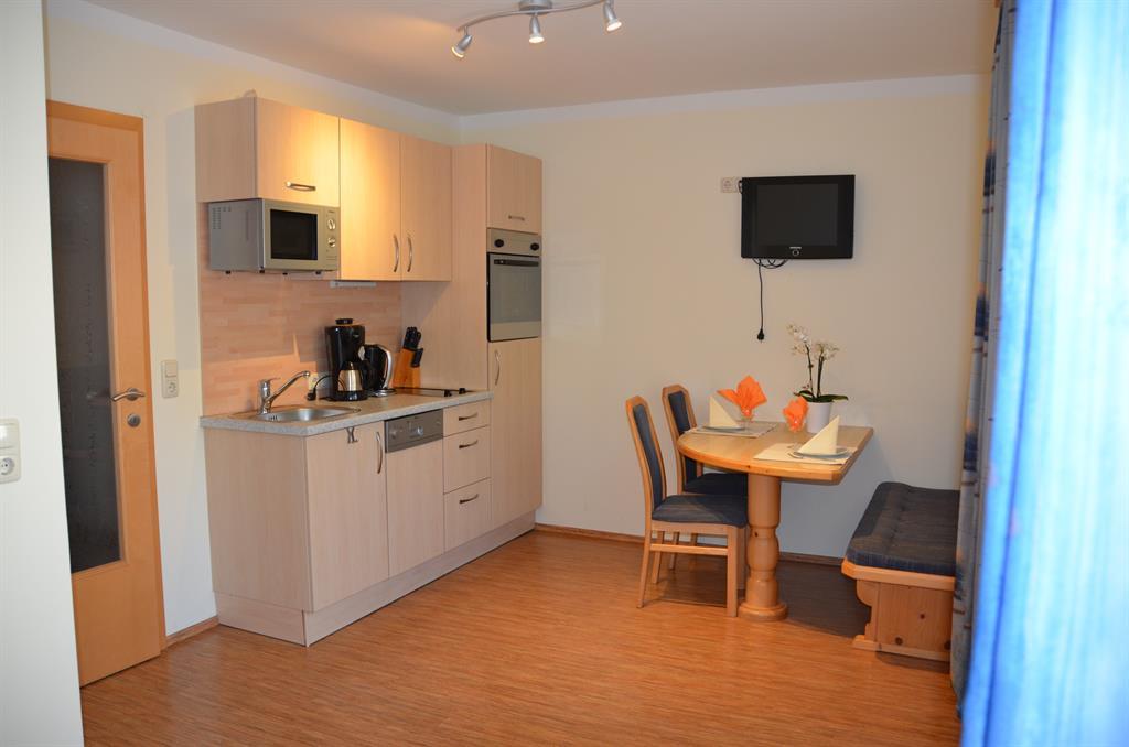 Küche mit Essbereich für 4 Personen, 2 Platten-Herd und Minibackofen, Geschirr, Geschirrspüler, Kaffeemaschine, Mikrowelle, Wasserkocher, Brötchenservice.