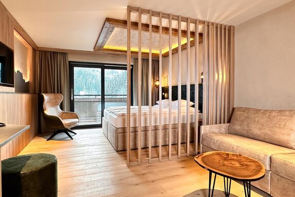 Hotelsuite Edelweiss mit Südbalkon - mit Infrarotkabine und Zirbenlüfter. Mit 36m² - auch als 3-Bett bzw. 4-Bett-Zimmer möglich. Neu renoviert, sehr gemütlich, mit Flat-TV, Gratis-W-Lan, Dusche und sep. WC. Weitere Infos unter www.alpenhof.com