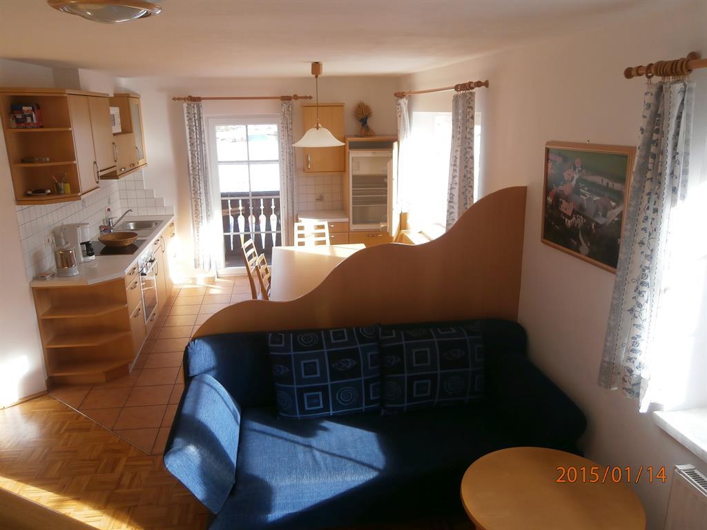 Komfortable 100 m² Wohnung über 2 Etagen in einem Nebengebäude direkt am Bauernhof. Vorraum mit Garderobe, geräumige Wohnküche, 3 Schlafzimmer (2 Doppelzimmer, 1 Dreibettzimmer,Zustellbetten möglich), Badezimmer mit Badewanne, Dusche, 2 WC und 2 Balkone. In den Schlafzimmern Vollholzmöbel aus Zirbe und Parkettböden. In jedem Stockwerk eigene Sanitärräume. Wohn-Küche mit E-Herd mit Backrohr, Mikrowelle, Kühlschrank mit Gefrierfach, Filtekaffeemaschine, Wasserkocher, Koch- und Essgeschirr, Eckbank mit Esstisch, Couch, SAT-TV, WLAN.