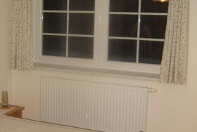 Sonniges Doppelzimmer mit Vorraum, Dusche, WC, südseitigem Balkon, SAT-TV, WLAN. Vollholzmöbel und Parkettboden.