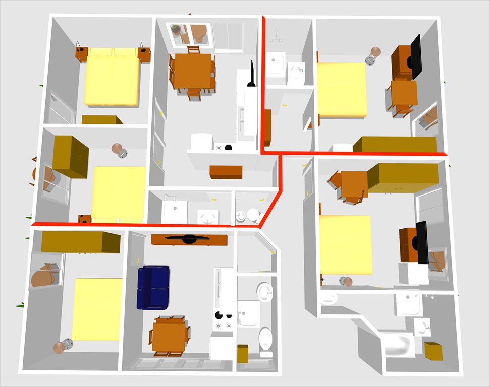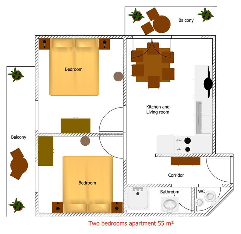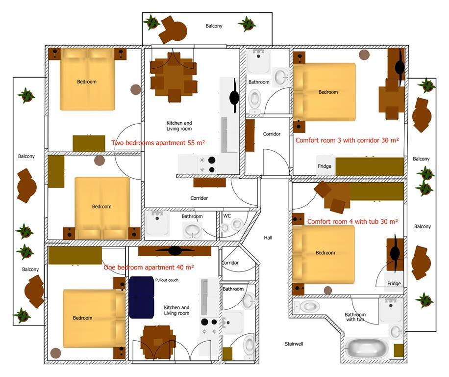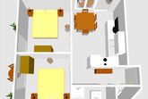 Appartement 2: Elektroherd mit vier Herdplatten, Kühlschrank, Kaffeemaschine, Wasserkocher, extra Vorraum, Bad/Dusche, getrenntes WC, Föhn, Balkon, Sitzgruppe, Sat-TV, Radio.