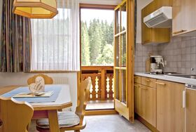 Die Appartements sind im unmittelbar anliegenden Nebenhaus, erbaut in den 90er Jahren, hell eingerichtet mit Voglauer Möbeln. Bodenbeläge teilweise mit Teppich. Appartement mit Schlafzimmer, Wohnbereich mit Küchenzeile mit Esstisch und Doppel-Ausziehcouch mit ca. 33 m² für bis zu 2 Erwachsene und 2 Kinder im 2. Stock Mit Balkon und Blick Richtung Süd-Osten Dusche, WC extra, Haarfön Kabel-TV , Telefon, WLAN