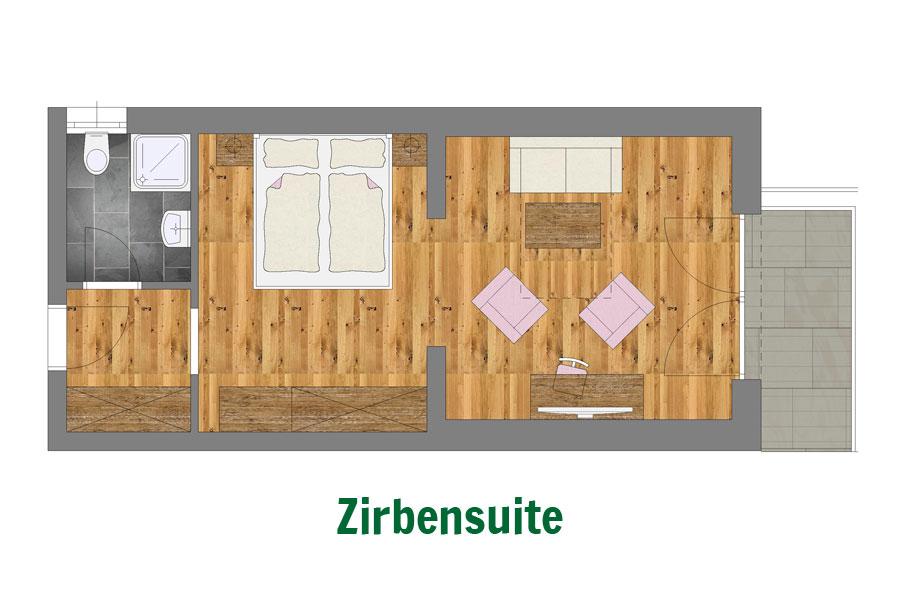 Eintreten und entspannen: Die exklusive Zirbensuite wirkt mit seinem aromatischen Holz beruhigend und ausgleichend. Die Zirbensuite hat einen Eichenholzfußboden und einen fantastischen Blick auf den Gosaukamm.