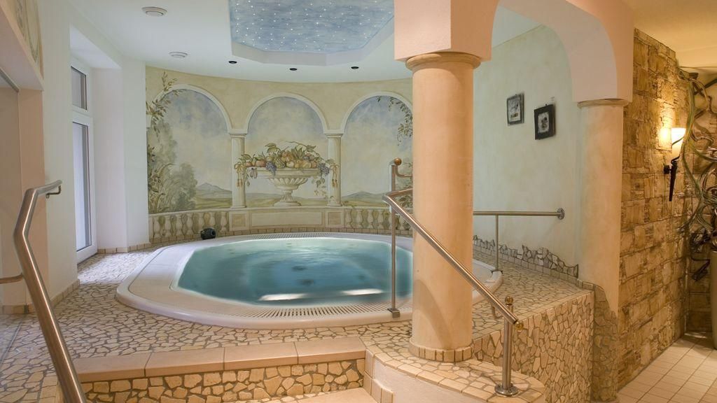großzügiger Whirlpool, ein Kneippwasserfall, Erlebnisduschen und Ruheliegen auf Sie.