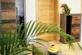 Die frühere Tenne, die an das anliegende Familienhaus anschließt, wurde abgerissen und komplett neu aufgebaut. Diesen Anbau schmückt ein riesengroßer Garten mit frischen Kräutern, Gemüse und vielen Blumen, die zum Verweilen einladen.