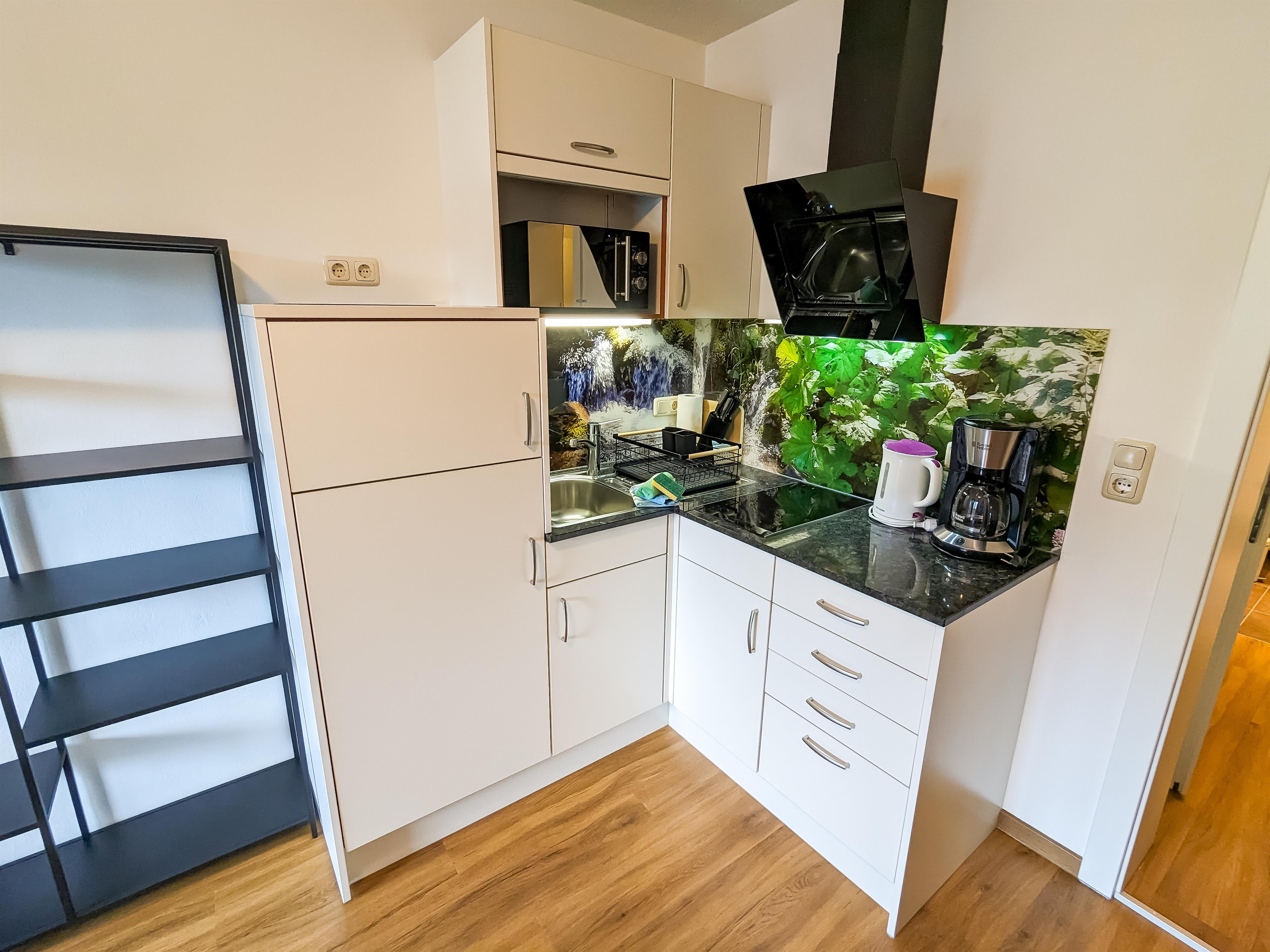Einraumappartement mit Kochnische, Zwei-Platten-Induktionsherd, Mikrowellenherd, gesamtes Geschirr, Kühlschrank, Kaffeemaschine, Toaster, Wasserkocher, Doppelbett, Flatscreen TV, gratis WI-FI, Essecke, Balkon mit wunderschönem Panoramablick, DU/WC (Kosmetikspiegel und Föhn), Vorraum.