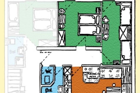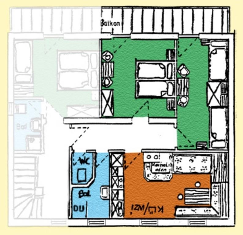 2. Stock - TYP D - 56 m2 Appartement für 2 - 6 Personen Wohnraum mit Küchenblock (Geschirrspüler) und Eßecke, Kachelofen, Couch, 2 Schlafzimmer, Bad, WC, Balkon, WLAN, Kabel-TV, Radio, Haarfön und Möbelsafe. Geschirr, Handtücher und Bettwäsche sind vorhanden. Ein weiteres Doppelzimmer auf Anfrage