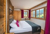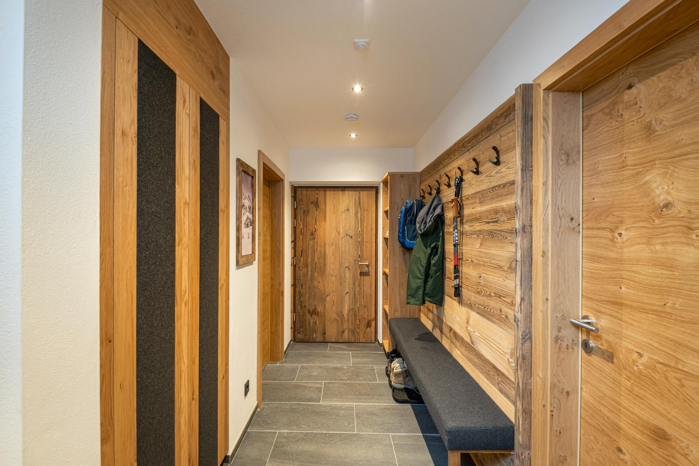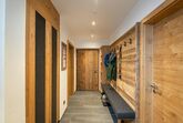 Das Premium-Chalet erstreckt sich über drei Etagen und ist im Außenbereich neben einem Skiraum (inkl. Skischuhtrockner) für das mitgebrachte Equipment mit einem Carport für zwei PKWs sowie bei Bedarf zwei weiteren Stellplätzen ausgestattet. Der Eingangsbereich befindet sich direkt im Anschluss an den Carport im Untergeschoss. Hier erreichen die Gäste direkt eines der vier Schlafzimmer, welches mit Doppelbett und en-suite Badezimmer mit Dusche, WC und Waschtisch keine Wünsche offen lässt. Ebenfalls im Untergeschoss ist die private Wellnessoase untergebracht, die Regeneration und Entspannung garantiert. In der eigenen Sauna finden die beanspruchten Muskeln schnell die nötige Erholung, im Ruheraum stehen bequeme Liegestühle bereit. Mit einer Dusche und einem separaten WC wird der Wellnessbereich komplettiert.