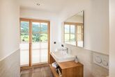 Über eine Treppe erreicht man das Erdgeschoss mit drei weiteren Schlafzimmern mit Doppelbetten, die ebenfalls über en-suite Badezimmer mit Waschtisch, Dusche und WC verfügen. Im größten Schlafzimmer, welches direkten Zugang zur schönen Sonnenterrasse besitzt, befindet sich zusätzlich noch eine Couch, die bei Bedarf in ein Stockbett verwandelt werden kann und somit zwei weitere Übernachtungsmöglichkeiten bietet. Sämtliche Schlafzimmer sind mit Holzboden und teilweise holzvertäfelten Rückwänden ausgestattet, die alpine Wohlfühlatmosphäre vermitteln. Für die Gäste steht zudem ein Waschraum mit Waschmaschine und Trockner zur Verfügung. Bei Bedarf kann auch ein Kinder-Reisebett bereitgestellt werden.