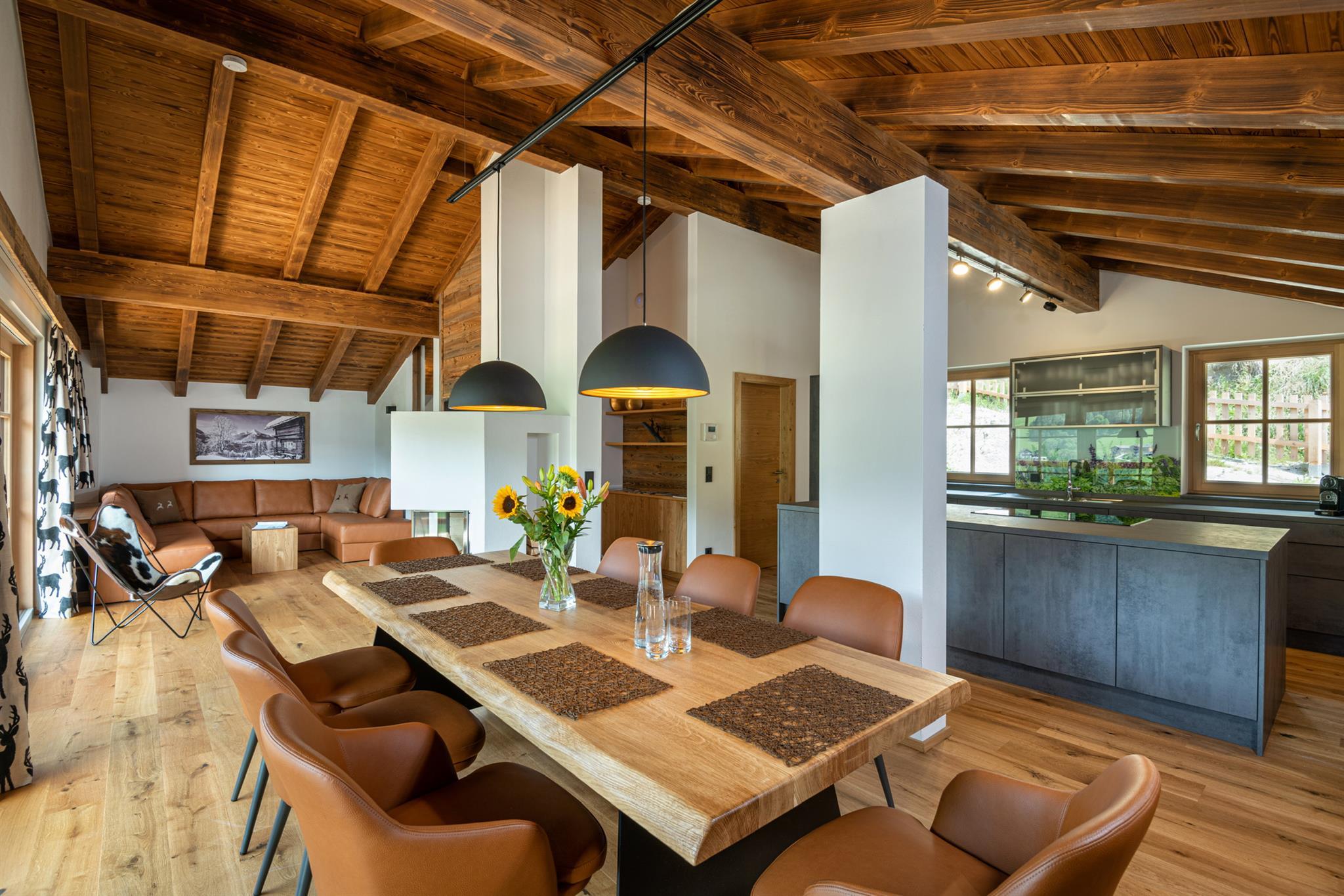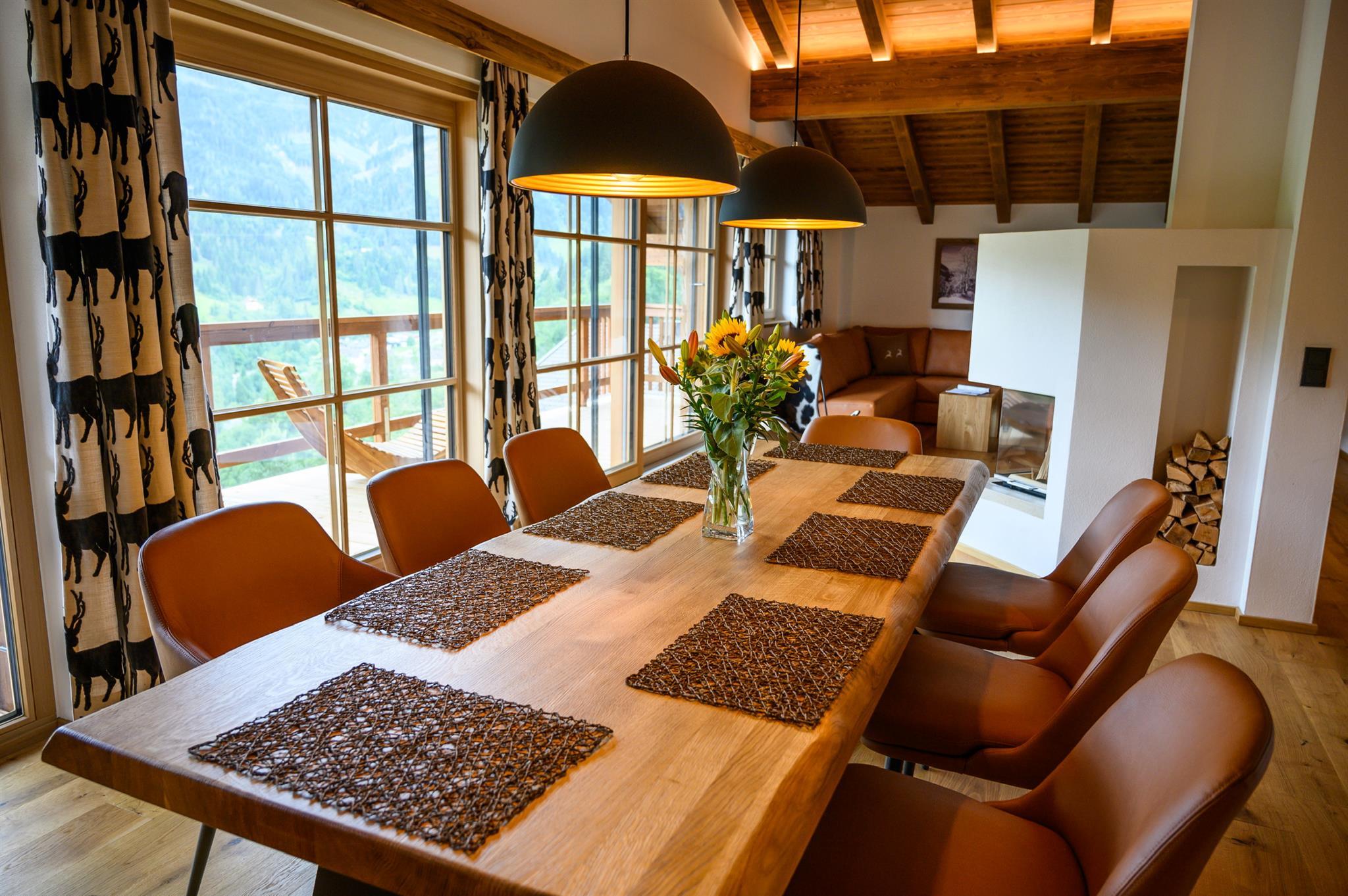 Eine Etage höher befindet sich mit dem großzügigen Wohn- und Essbereich sowie der modernen, offenen Küche das Herzstück des Chalets. Mit zwei Spülmaschinen, einem großen Kühlschrank, Backofen inklusive Dampfgare, Kochfeld mit integriertem Dampfabzug sowie Nespresso-Maschine mit Milchschäumer bildet die Küche die perfekte Voraussetzungen für gemeinsame Kochabende mit Familie oder Freunden. In der angrenzenden Speisekammer steht eine weitere Kühl-Gefrierkombination zur Verfügung. Am großen stilvollen Esstisch aus Echtholz mit bequemen Lederstühlen finden alle Gäste problemlos Platz und können während dem Essen den faszinierenden Panoramaausblick genießen. Bei Bedarf werden auch zwei Kinderstühle bereitgestellt. Von hier sowie vom benachbarten Wohnbereich mit riesiger Ledercouch besteht direkter Zugang zum sonnigen Balkon. Ein großer Flat-TV an der Wand und SONOS-Boxen sorgen zudem für Unterhaltung, während der Kaminofen wohlige Wärme und romantisches Ambiente verbreitet.