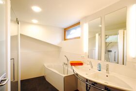 Das Bad ist verfliest und mit WC- Anlage, zusätzlicher Absaugung, Doppelwaschtisch und Badewanne samt großzügiger Duschnische mit Glastüre ausgestattet.