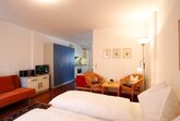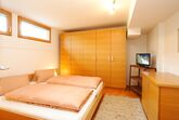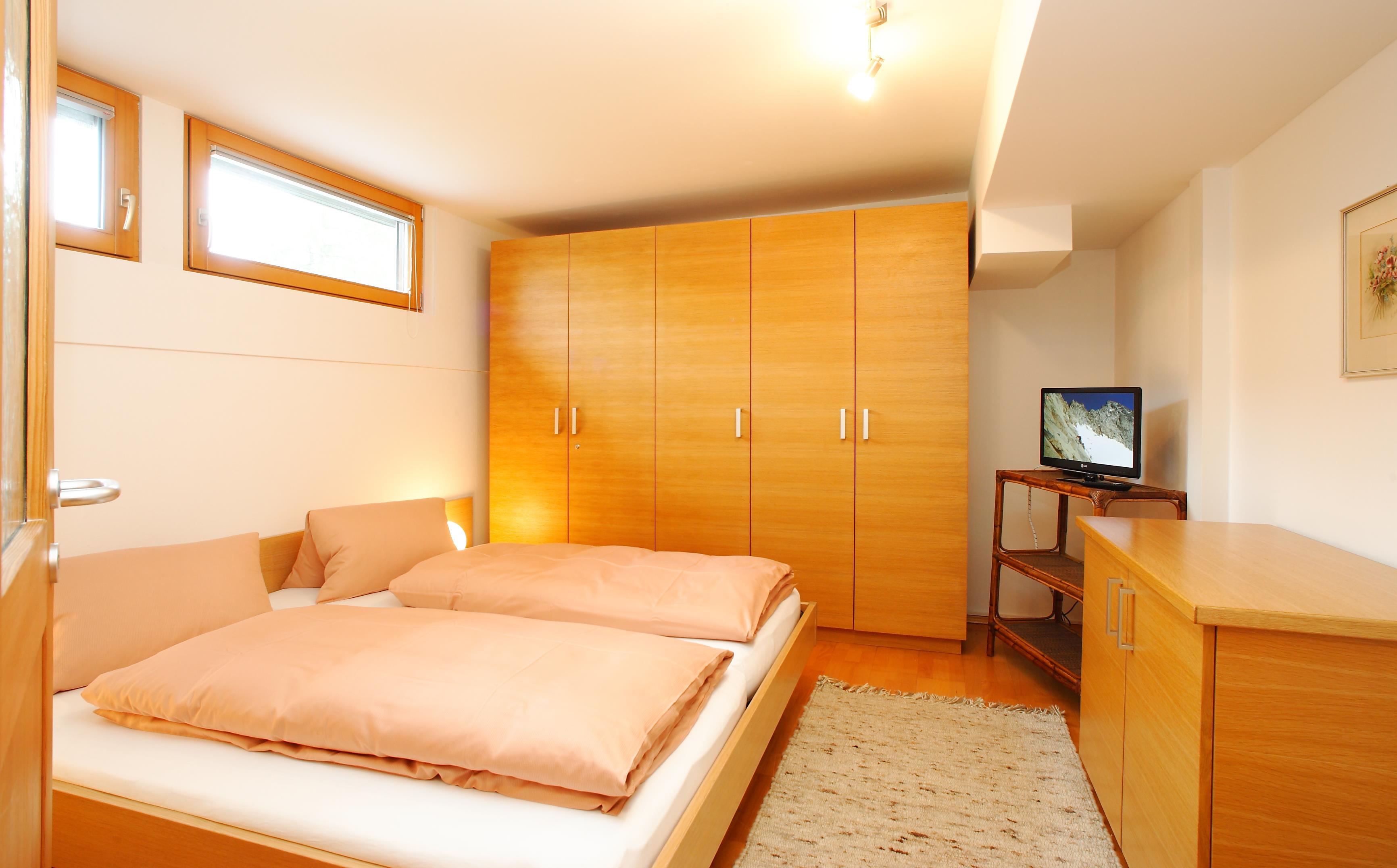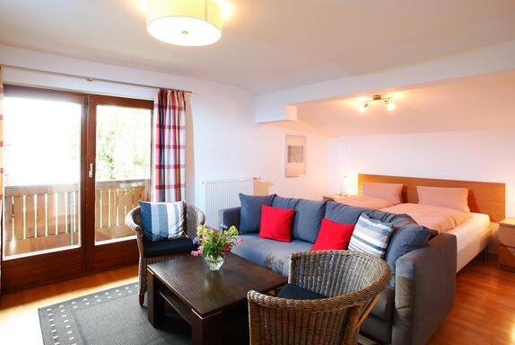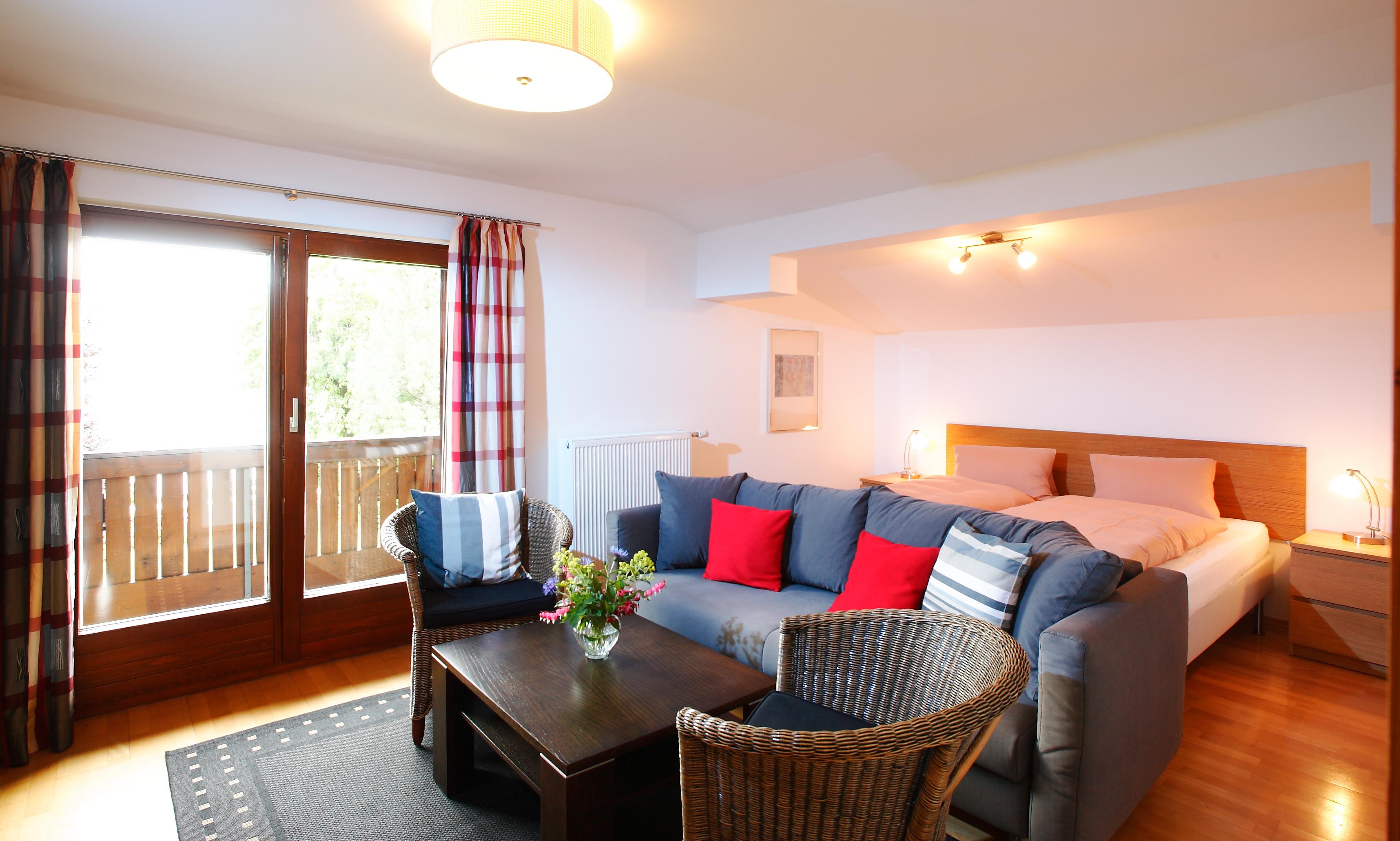 Über einen Vorraum mit Garderobe erreicht man einen nach Süden zum See orientierten Wohnraum mit Balkon und großartiger Aussicht über den See und den Garten, mit bequemer Wohn-Sitzgruppe mit großer Couch, dahinter ein Doppelbett. Ein weiterer, separater Schlafraum mit Doppelbett, großem Kleider- und Wäscheschrank.