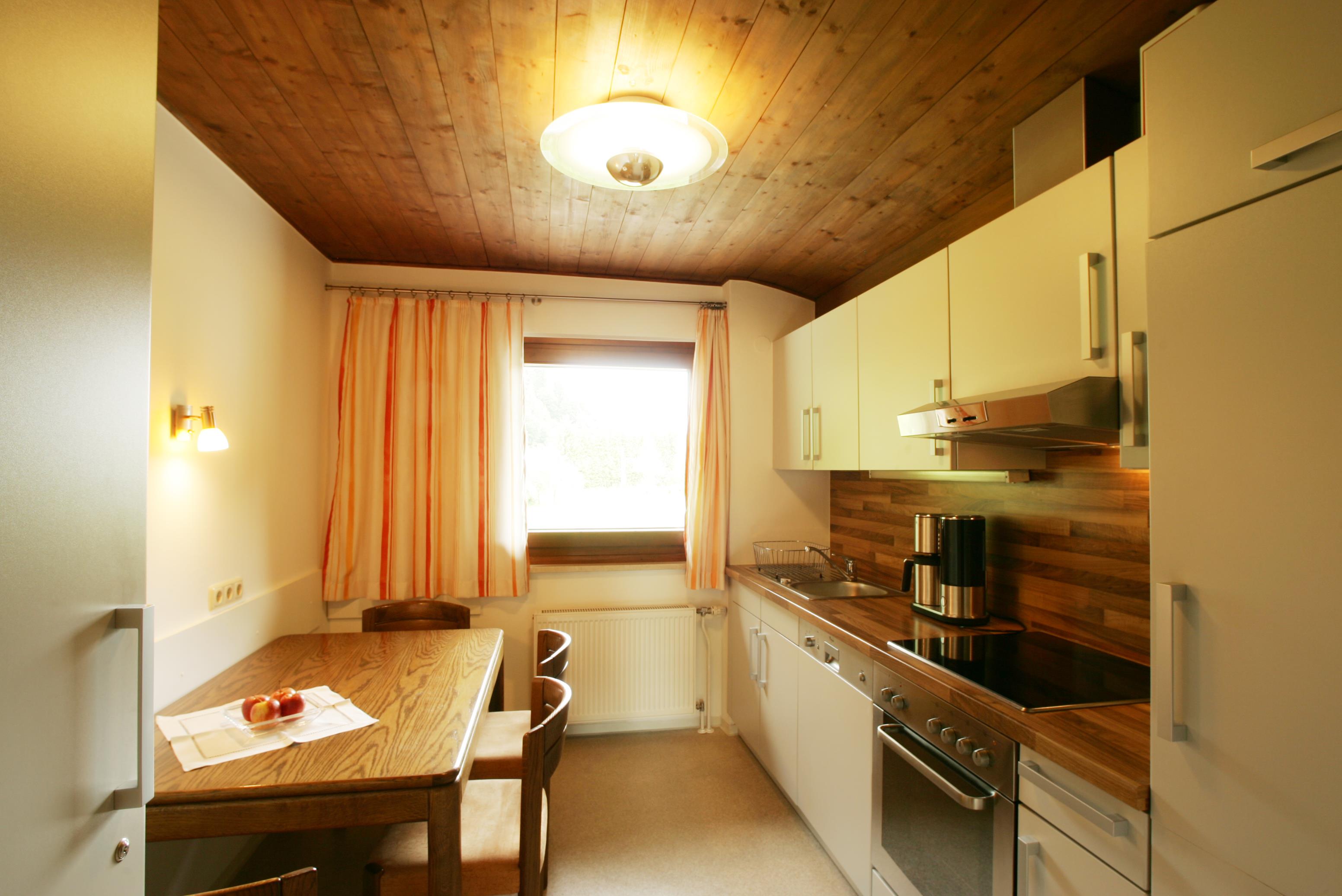 Die Küche verfügt über komplette Geräteausstattung und einen großen Essplatz.
