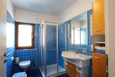 Das Bad beinhaltet eine Dusche mit Duschwand, einen großen Waschtisch mit seitlichen Ablagen, einen Schrank und eine WC- Anlage.