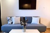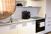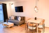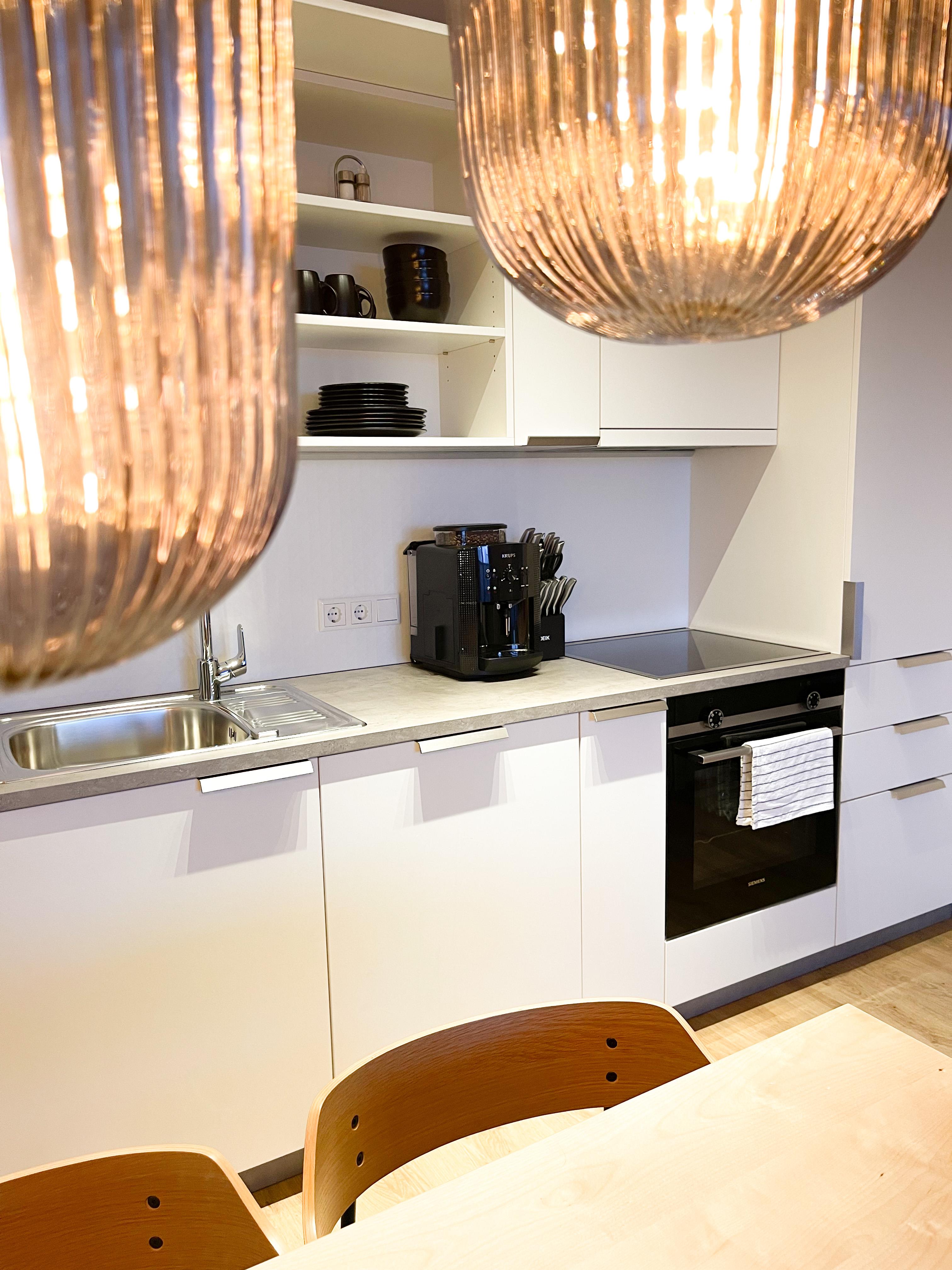 1 Schlafzimmer mit Doppelbett, 1 Wohnimmer mit Ausziehcouch für 2 Personen und Schlafcouch für 1 Person; Bad mit WC / Dusche, Fön, Kosmetikspiegel; Küche mit Kaffeemaschine, Geschirrspüler, Herd, Backofen; großer Ess-Wohnbereich mit Smart-TV