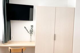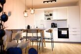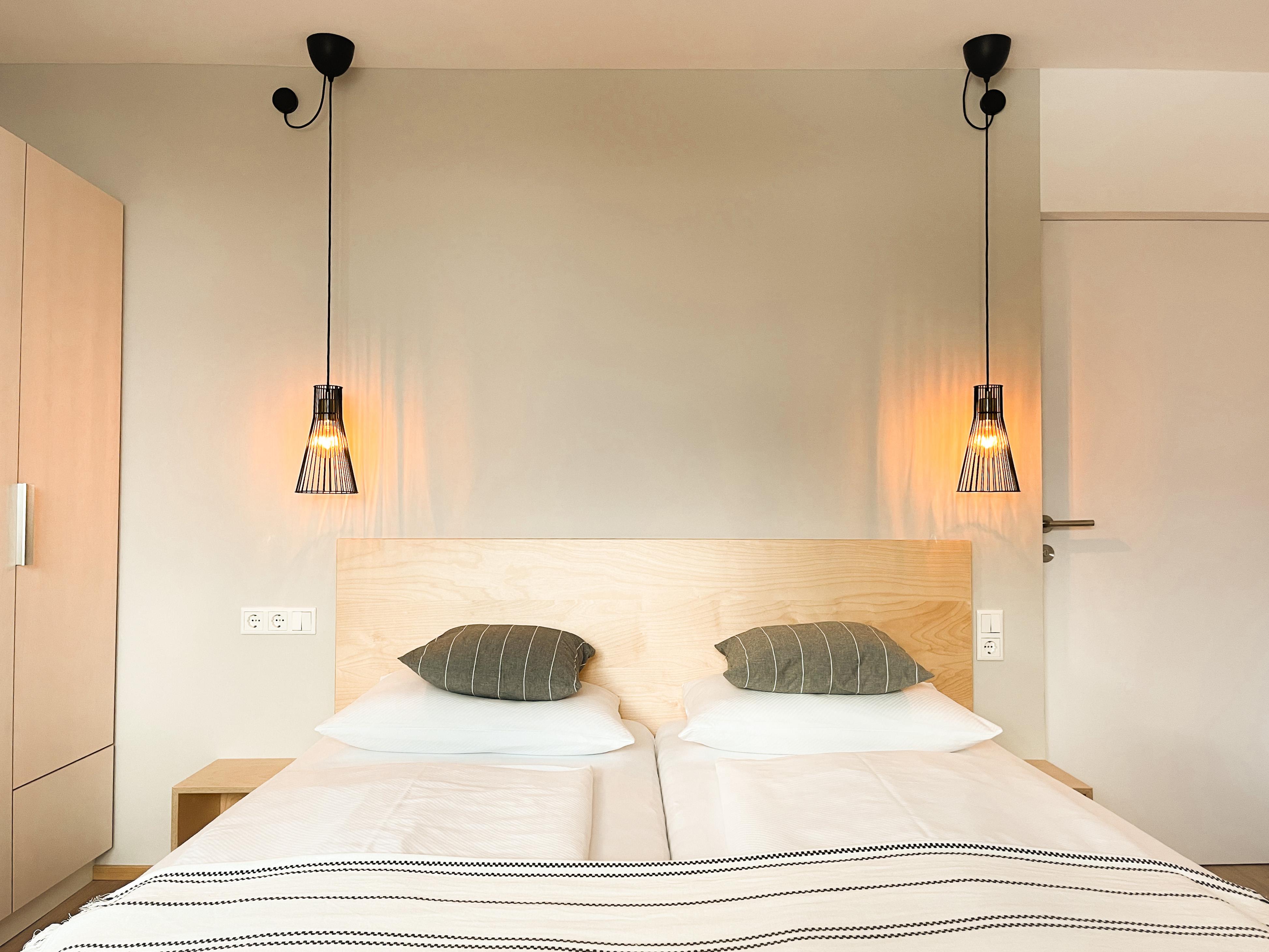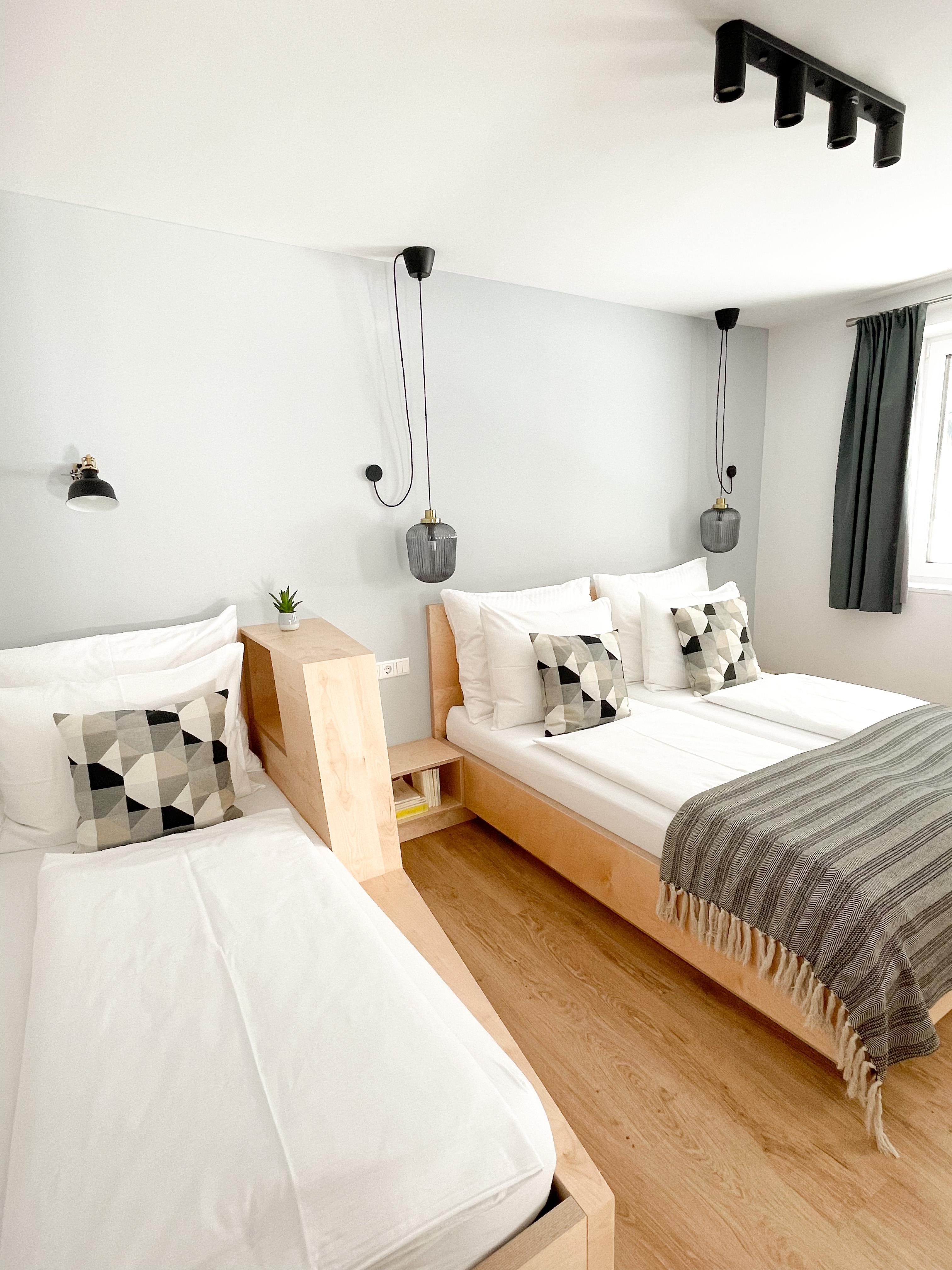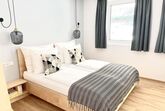 1 Schlafzimmer mit Doppelbett und 1 Einzelbett, 1 Wohnzimmer mit Ausziehcouch für 2 Personen; Bad mit Dusche, WC separat, Fön, Kosmetikspiegel; topmoderne Küche mit Kaffeemaschine, Geschirrspüler, Herd, Backofen; großer Ess-Wohnbereich mit Smart-TV