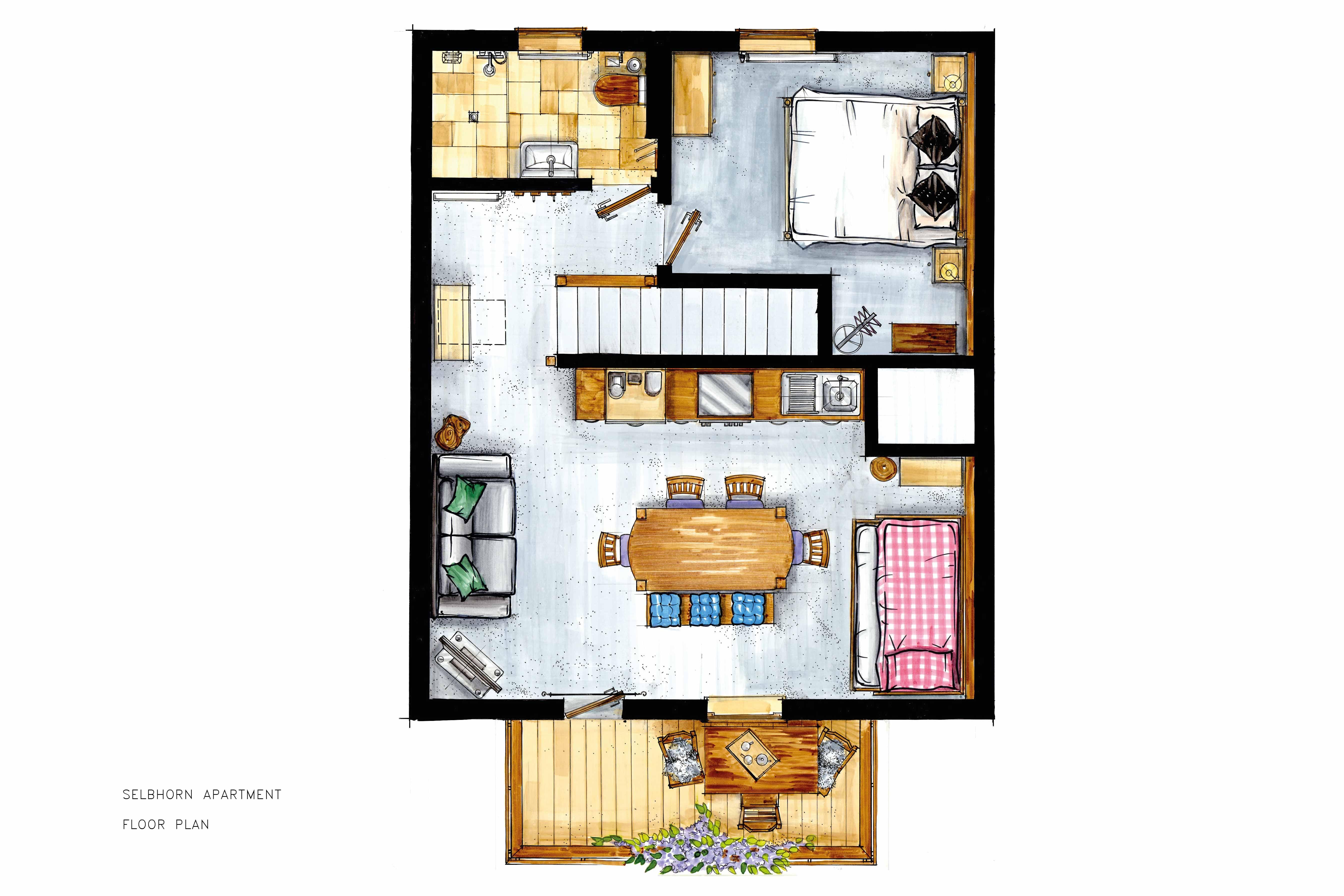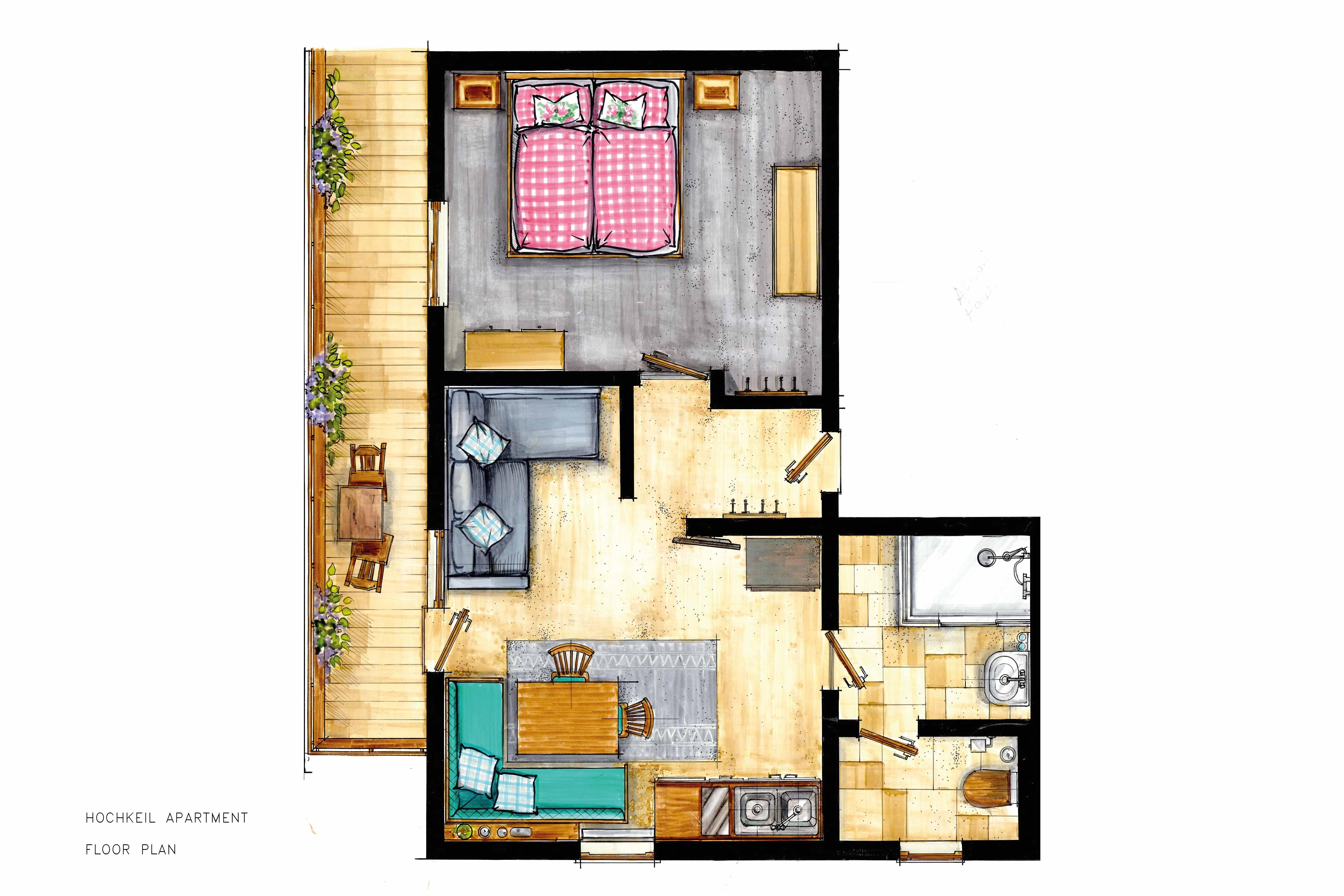 Hochkeil Wohnung ist etwas kleinere Wohnung mit einem Schlafzimmer (ca. 40m²) mit Kueche / Ess- / Wohnbereich und Bad mit Dusche, Waschbecken und WC. Es gibt ein Oesterreichisches Zwillingsbett im Schlafzimmer und ein Sofa, das in ein Doppelbett im Wohnbereich umgewandelt wird. Der Wohnbereich faehrt auf den Balkon mit herrlichem Bergblick. Die Kueche ist ausgestattet mit einem 2-Plattenherd, Mikrowelle, Kuehlschrank mit Gefrierfach, Spuele, Toaster, Kaffeemaschine, Geschirr und Besteck und Kochutensilien. Es gibt einen Flachbild-TV mit Satelliten-Kanaelen im Wohnzimmer