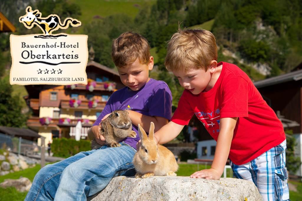 Natur-verbundener Familienurlaub im Bauerhof-Hotel Oberkarteis. Gelungene Kombination aus komfortablem 4*Hotel, intaktem Bauernhof und abwechslungsreichem Kinderprogramm für Ihren Sommer- und Winterurlaub. (rund 40h/Woche) Sommer: 4000m² großes Außengelände mit Abenteuer-Spielplatz, Fussballplatz, Go-Karts, etc., Kinderprogramm mit täglichen Ausflügen in die Natur Winter: Skibushaltestelle und Loipen-Einstieg direkt vom Hotel. Hauseigener Skikindergarten mit Skilehrer und Laufband. Tolles Winter-Kinderprogramm Bei jedem Wetter: - Erlebnis-Hallenbad mit 30°C Wassertemperatur und Kinderbecken, Chlorfreies Wasser - Indoor-Erlebnis-Zentrum (100m² Fussballhalle, 80m² Freizeitzentrum und 100m² Kindergarten mit Spiel- Lese- und Bastelecke)