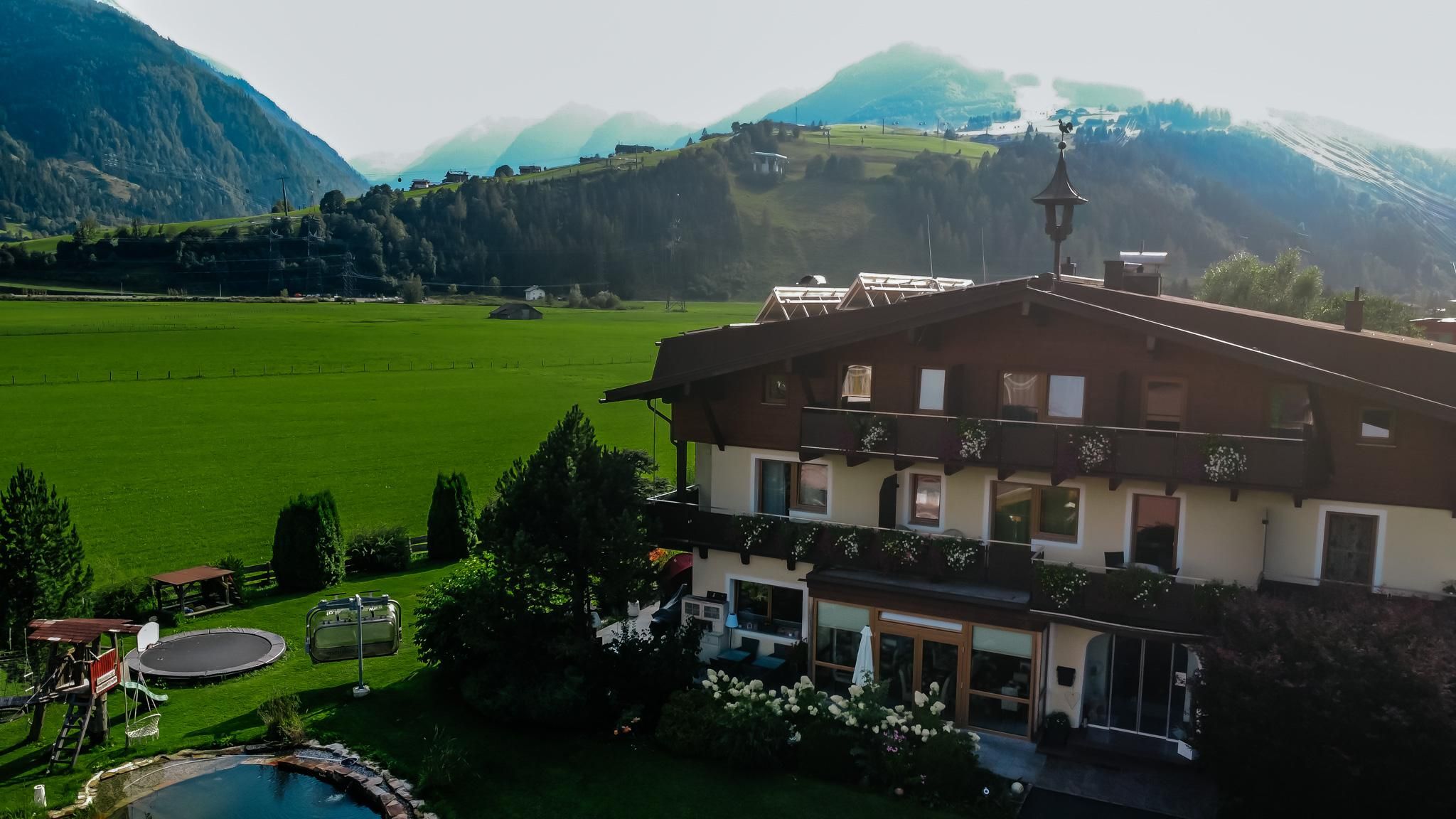Alle Zimmer bieten Dusche/WC, Balkon, Flat-TV sowie Familienzimmer mit separaten Kinderzimmern. Morgens vom Pinzgauer Frühstücksbuffet Regionales und Selbstgemachtes genießen. Die große sonnige Liegewiese mit Schwimmteich garantiert im Sommer einen herrlichem Ausblick auf das Panorama von Kaprun und Kitzsteinhorn.