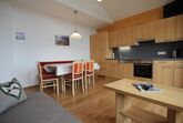 In jedem Appartement findet sich auch eine große Küchenzeile, die komplett eingerichtet ist, mit Geschirrspüler, Backrohr, Kühl- und Gefrierschrank.