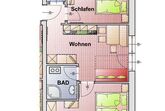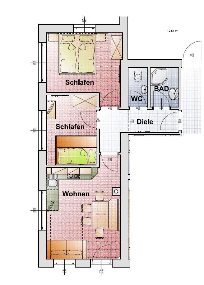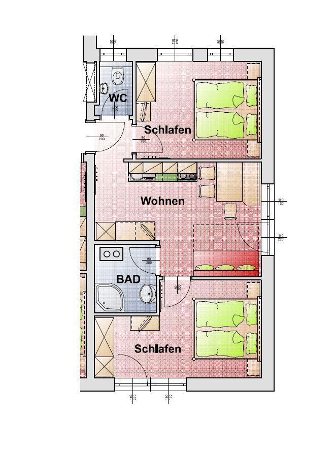 ca. 50 m² grosses Appartement im 1. Stock mit 2 Schlafzimmer; ein Schlafzimmer mit Stockbett; südseitiger Balkon; Dusche und WC getrennt; für bis zu 5 Personen. Bei 2 Personen steht Ihnen 1 Schlafzimmer pro Ferienwohnung zur Verfügung.
