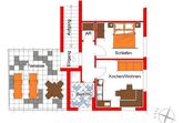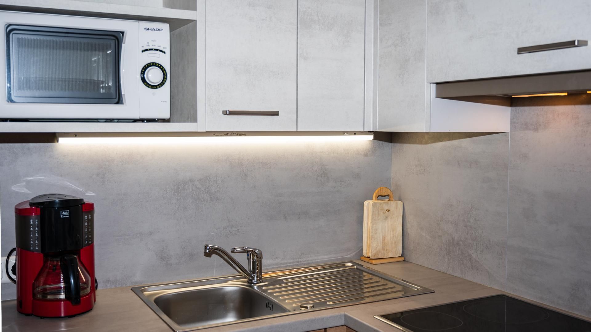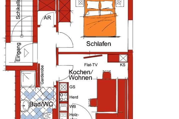 Ausstattung der Wohnung: eine Wohnküche (E-Herd mit Backofen, Mikrowelle, Geschirrspüler, Kühlschrank inkl. Gefrierfach, Safe) mit Esstisch und Wohnbett für 2 Personen, ein Doppelschlafzimmer, Schrankraum, Badezimmer/WC,Kosmetikspiegel, Flat-TV, Internetzugang