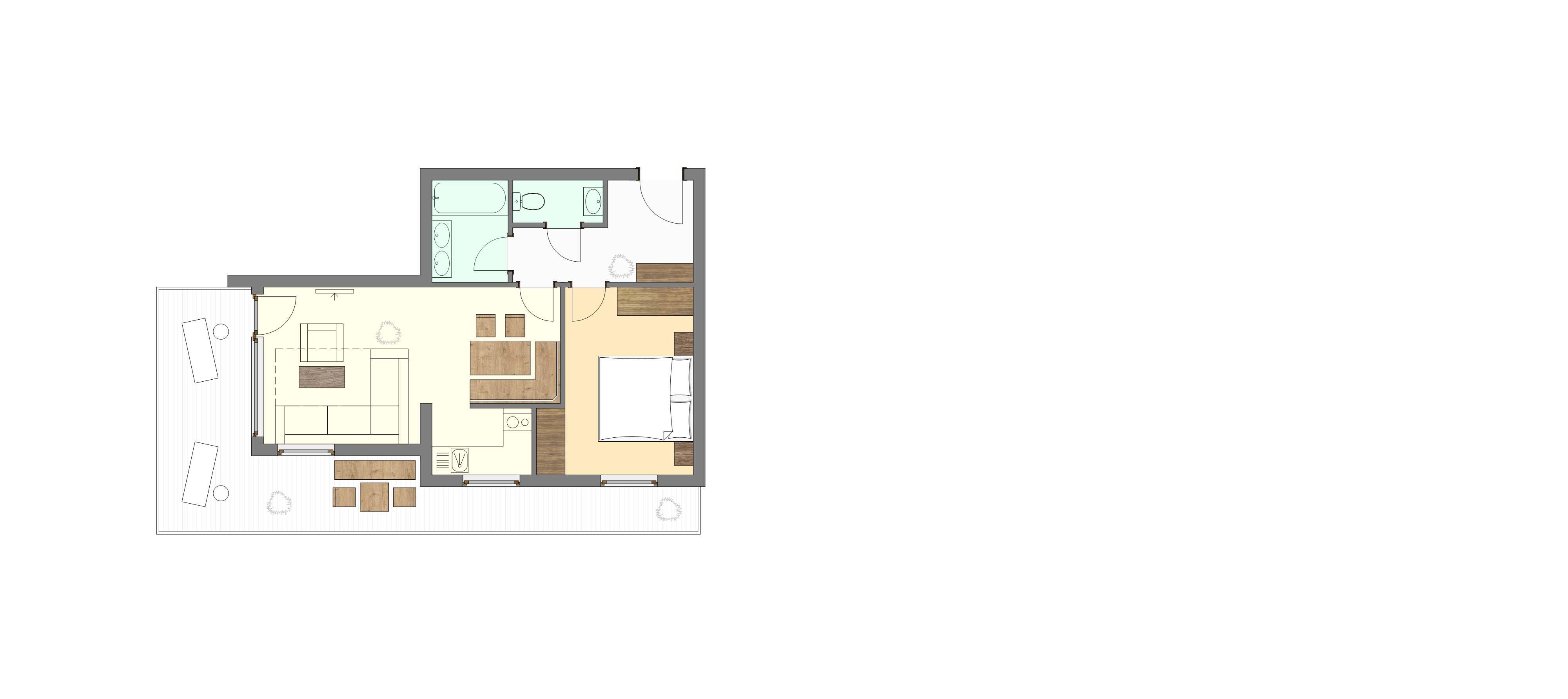 Geräumiges Appartement - 45 m² - mit einem eigenen Schlafzimmer mit Doppelbett. Im Wohnzimmer befindet sich eine Doppelbettcouch, die Küche mit Geschirrspüler, gemütliche Essecke, Badezimmer mit Dusche, WC separat, großer möblierter Balkon.