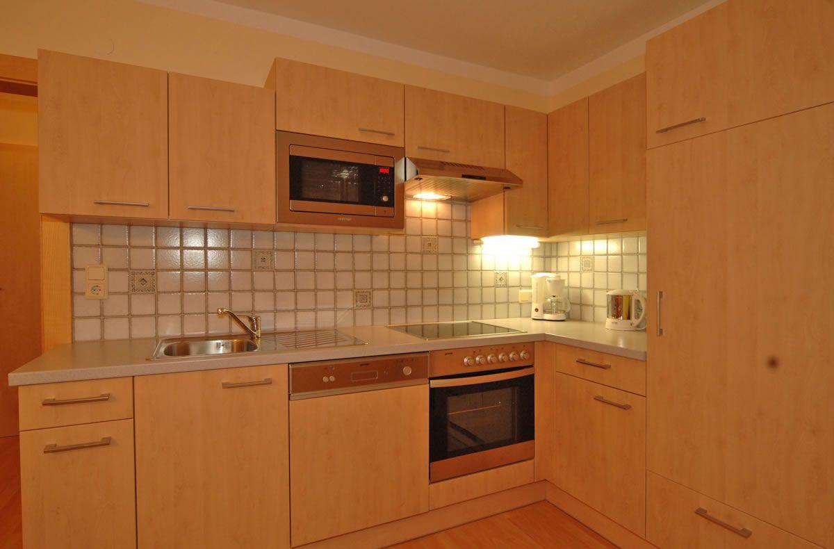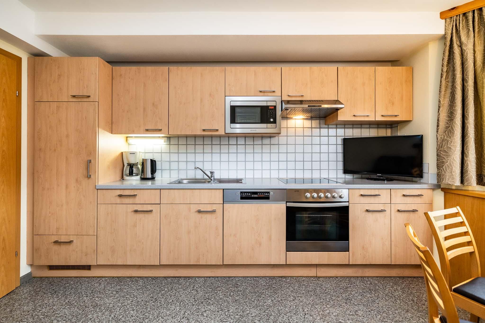 Wohnraum mit komplett ausgestatteter Küche oder Kochnische (von den Schlafräumen getrennt)