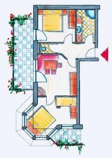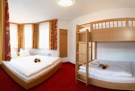 Appartemetn Alpenstern: großzügige Wohnküche, 1 Doppelzimmer, 1 Vierbettzimmer m. Doppelcouch im Erker u. Stockbett, großer eigener Balkon, Bad u. WC getrennt, Vorraum m. Garderobe