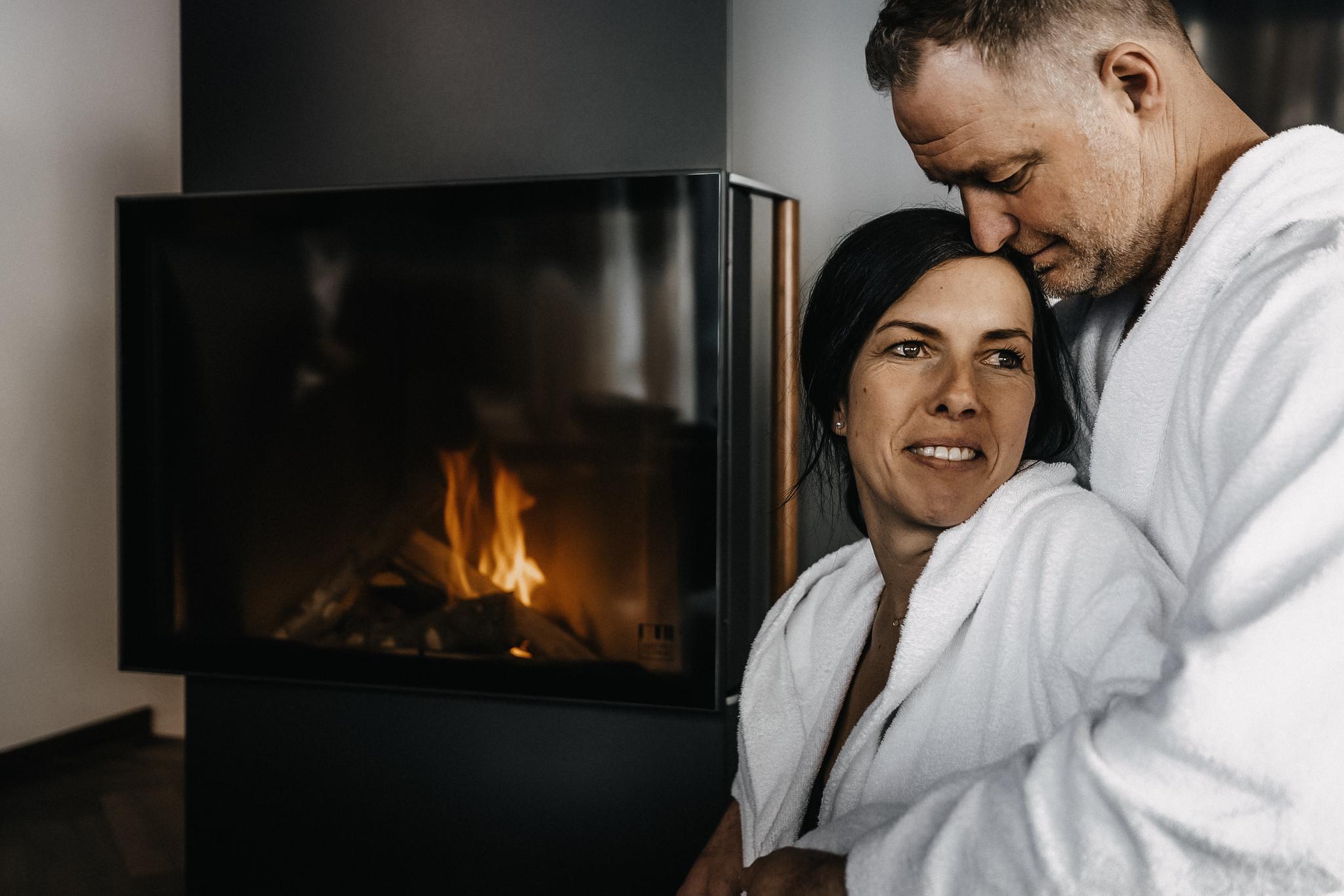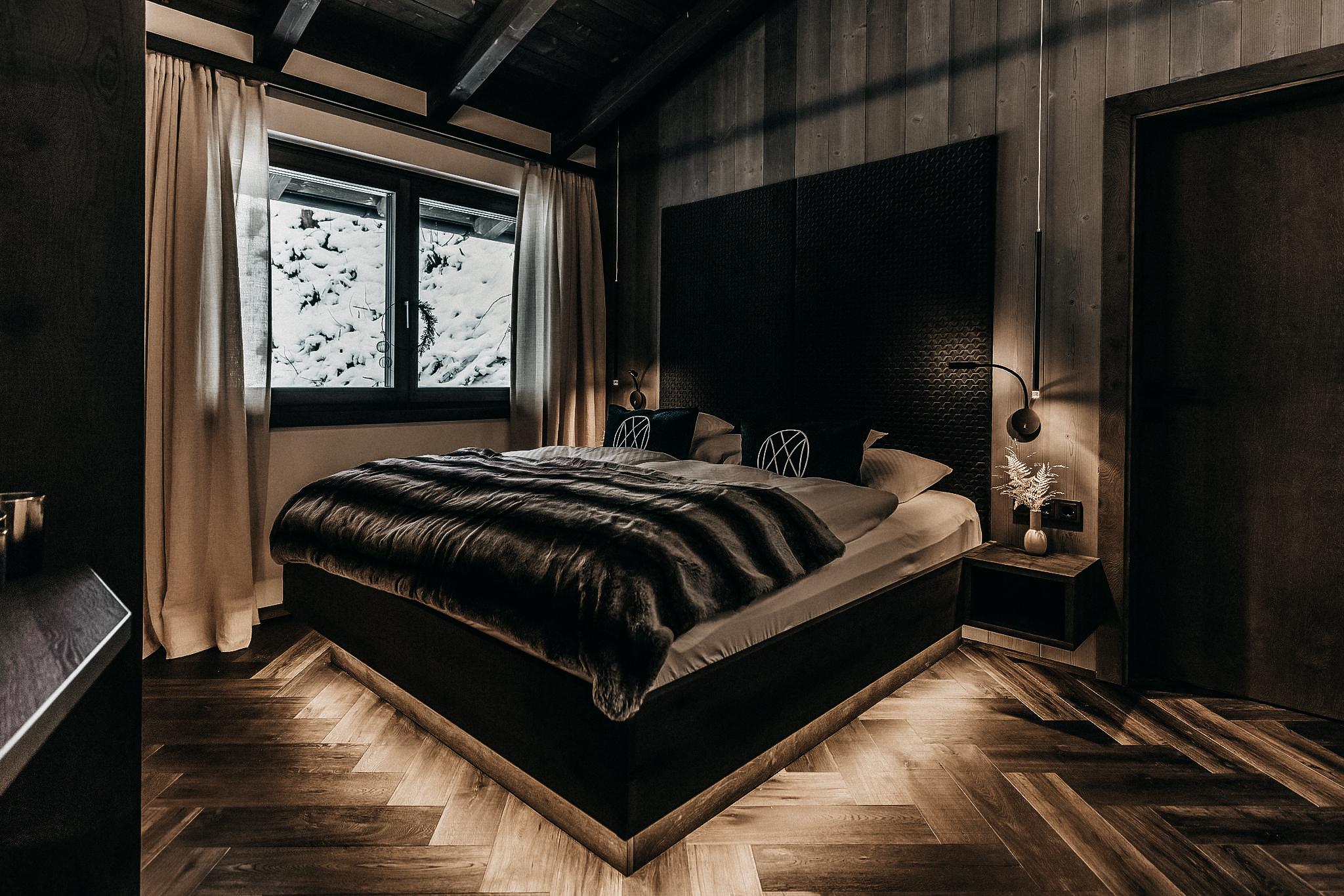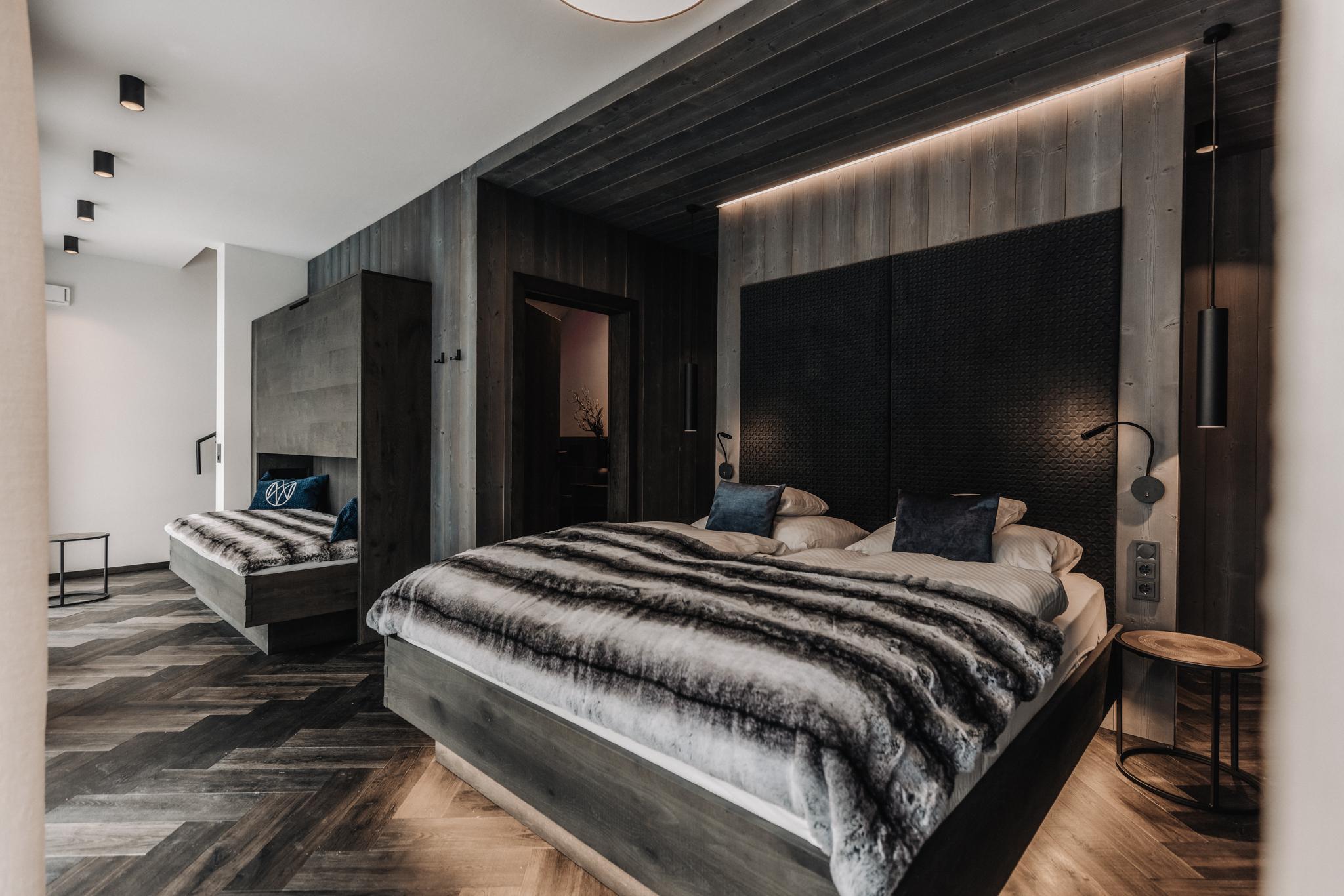 Auf 3 Stockwerken verteilt stehen drei Schlafzimmer inklusive privatem Badezimmer zur Verfügung. Im Doppelzimmer im UG bietet sich ein beeindruckender Blick durch die große Glasfront, die anderen Schlafzimmer sind direkt bei Wellness- und Wohnbereich. Wir achten auf Naturmaterialien und Details, der Designerholzkamin im Wohnbereich ist ein besonderes Highlight.