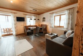Großräumige Wohnküche mit Essecke und ausziehbarer Couch (für 2 Pers.), Geschirrspüler
