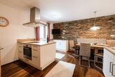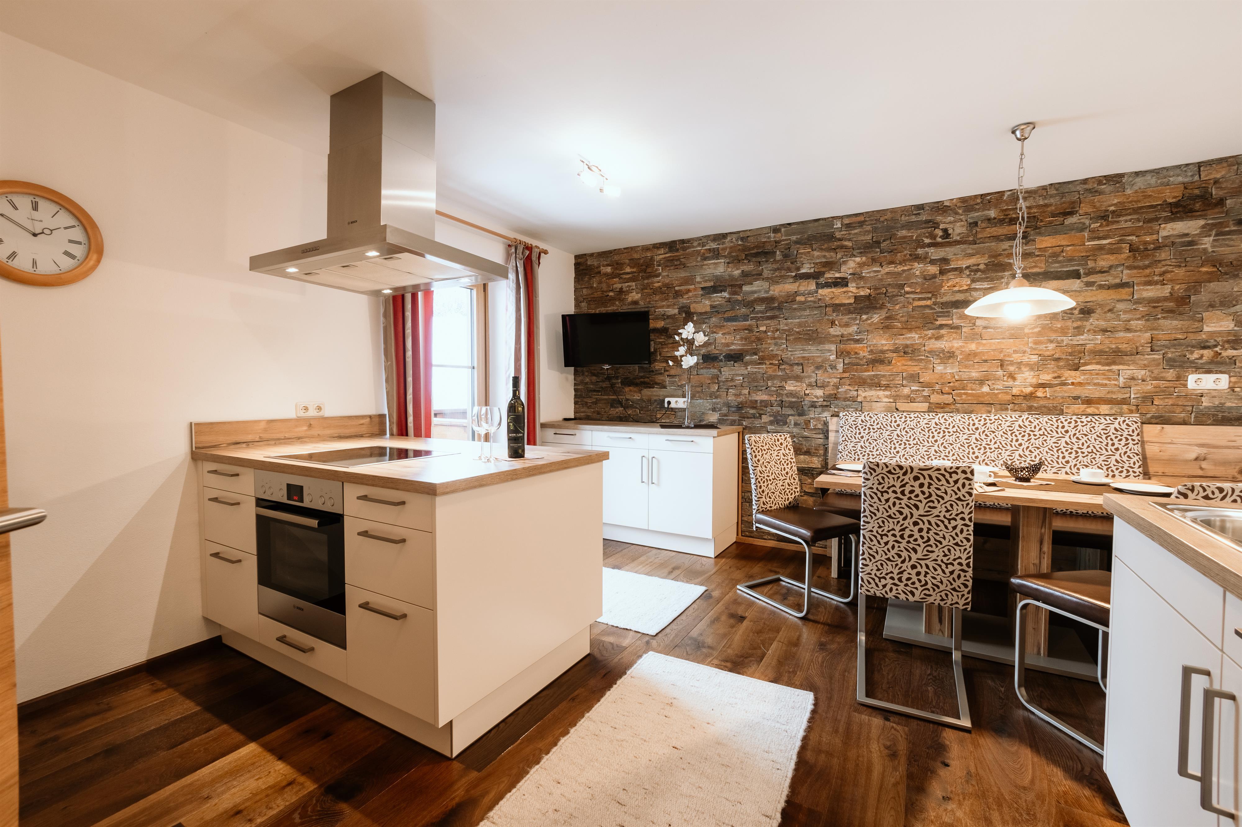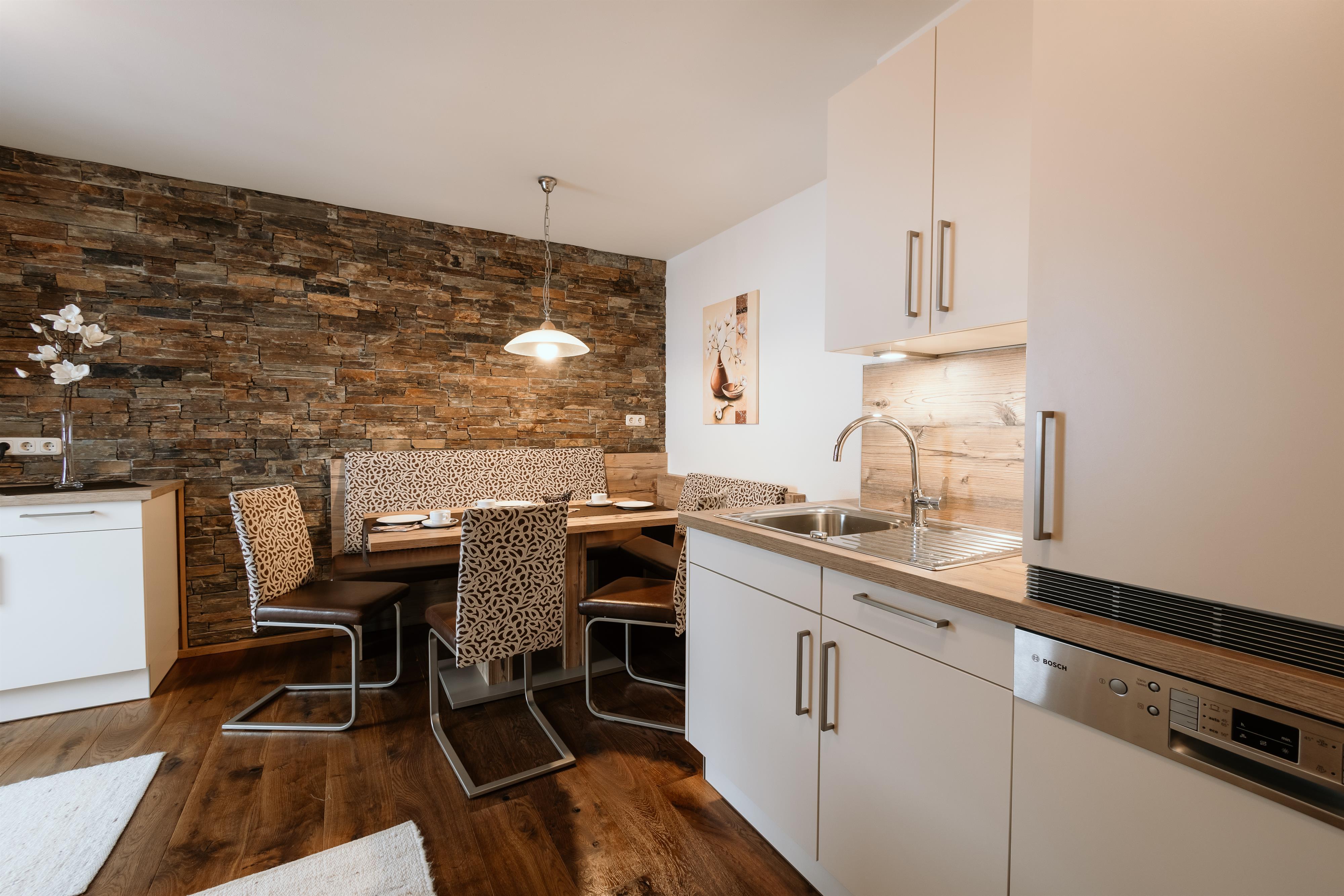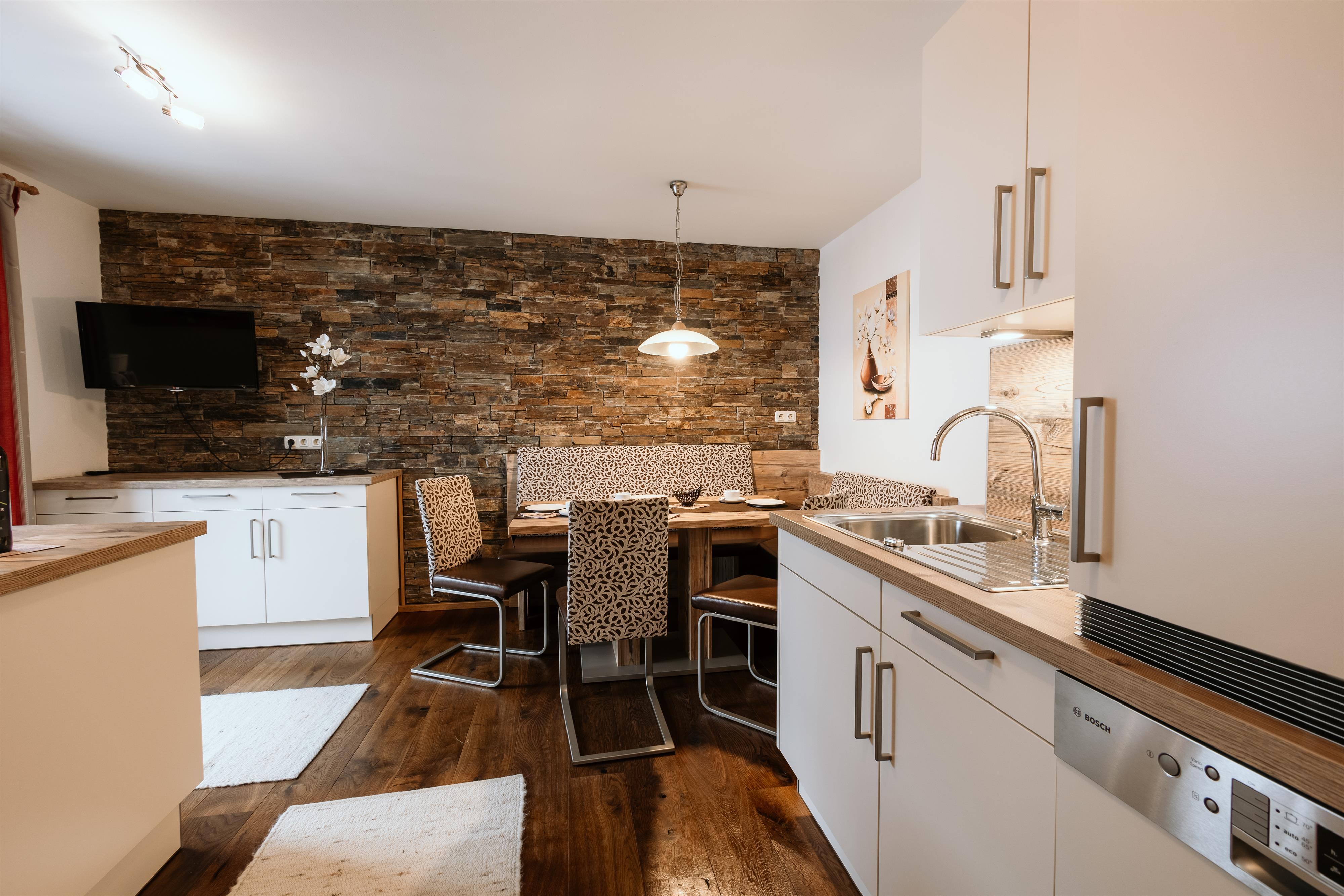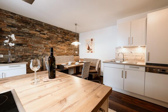 Ferienwohnung für 4 - 6 Personen. Großräumige Wohnküche, Geschirrspüler, gemütliche Essecke;