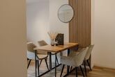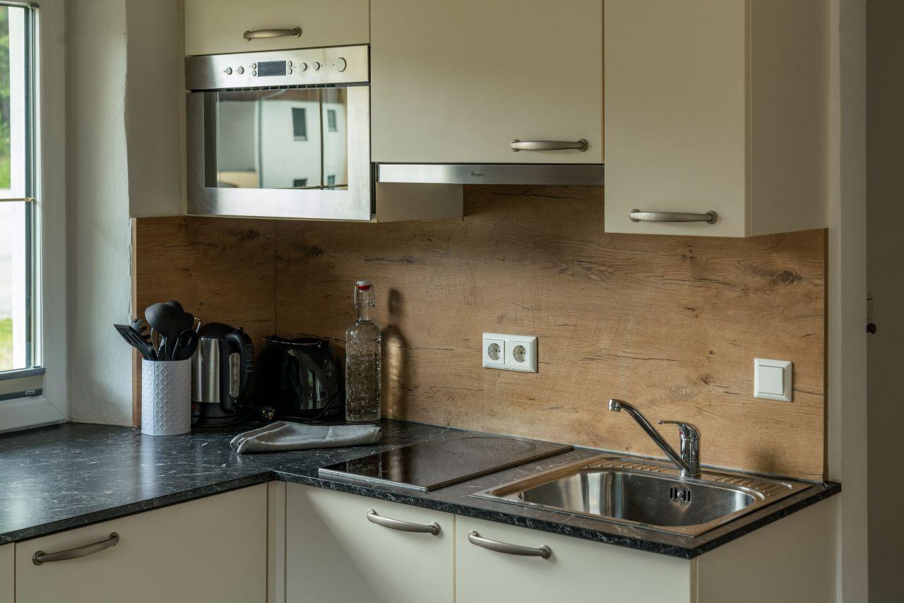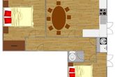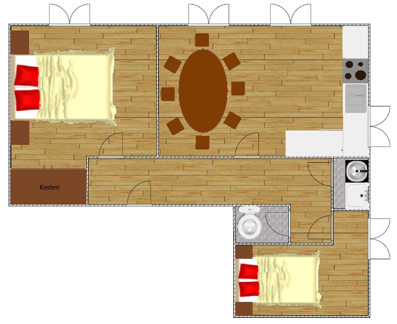 2 Schlafzimmer (Doppelbett), Bad (Dusche), WC getrennt, gemütliche Essecke, Küchenzeile, Elektroherd mit Ceranfeld, Backrohr, Geschirrspüler, Mikrowelle, Kaffeemaschine, Wasserkocher, Kühlschrank, Gefrierfach usw.
