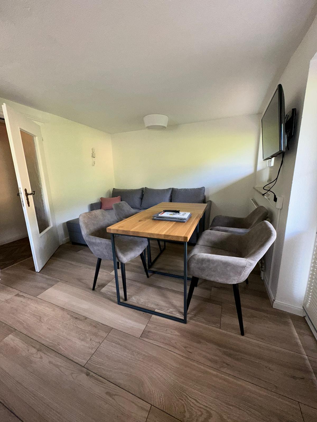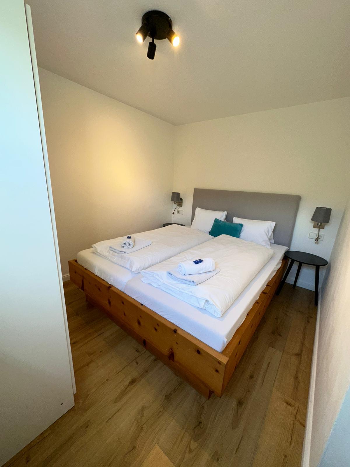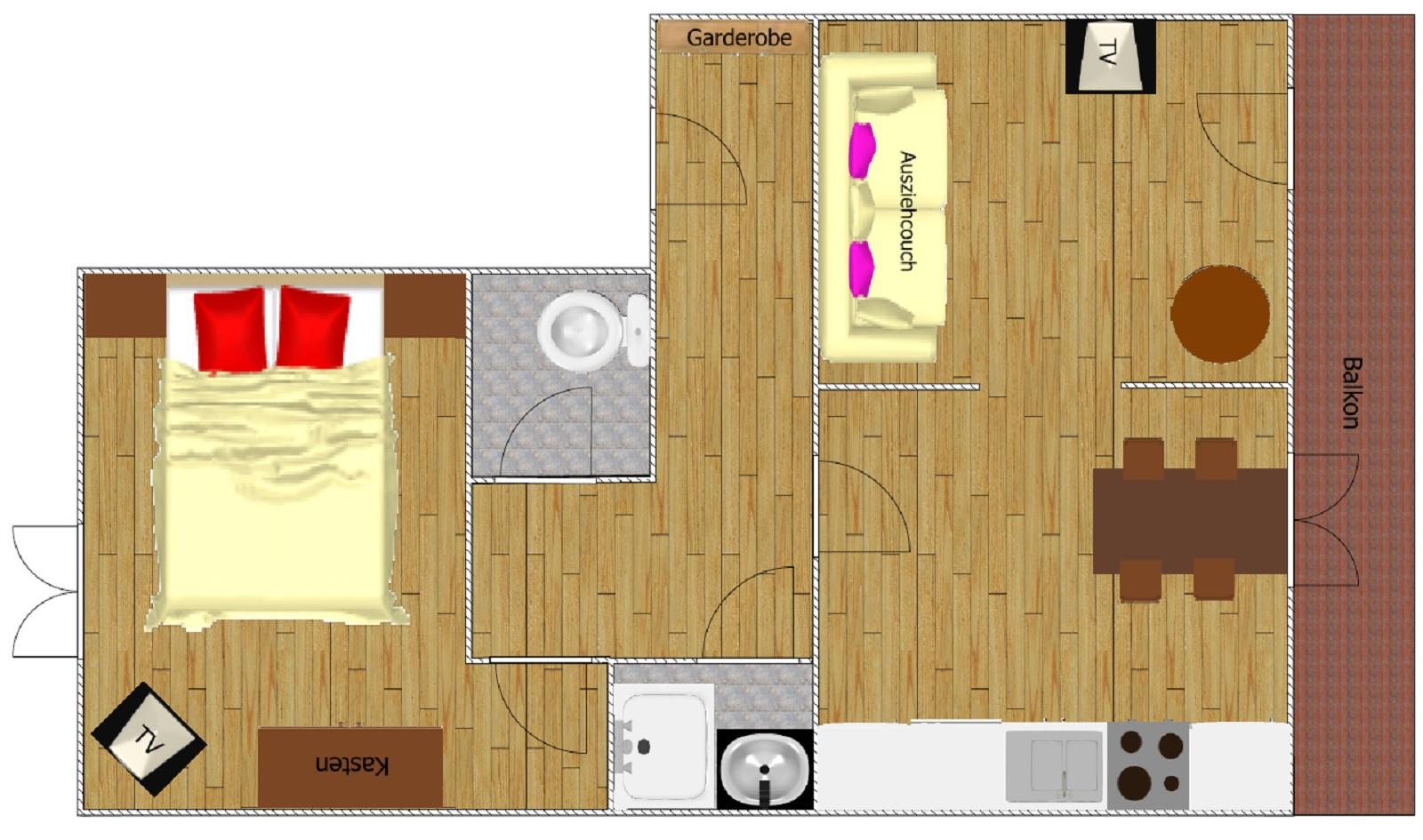1 Schlafzimmer (Doppelbett), 1 Wohnschlafraum mit Ausziehcouch, Bad (Dusche), Bad/WC getrennt, Essecke, Küchenzeile, Elektroherd mit Ceranfeld, Mikrowelle, Kaffeemaschine, Kühlschrank usw.