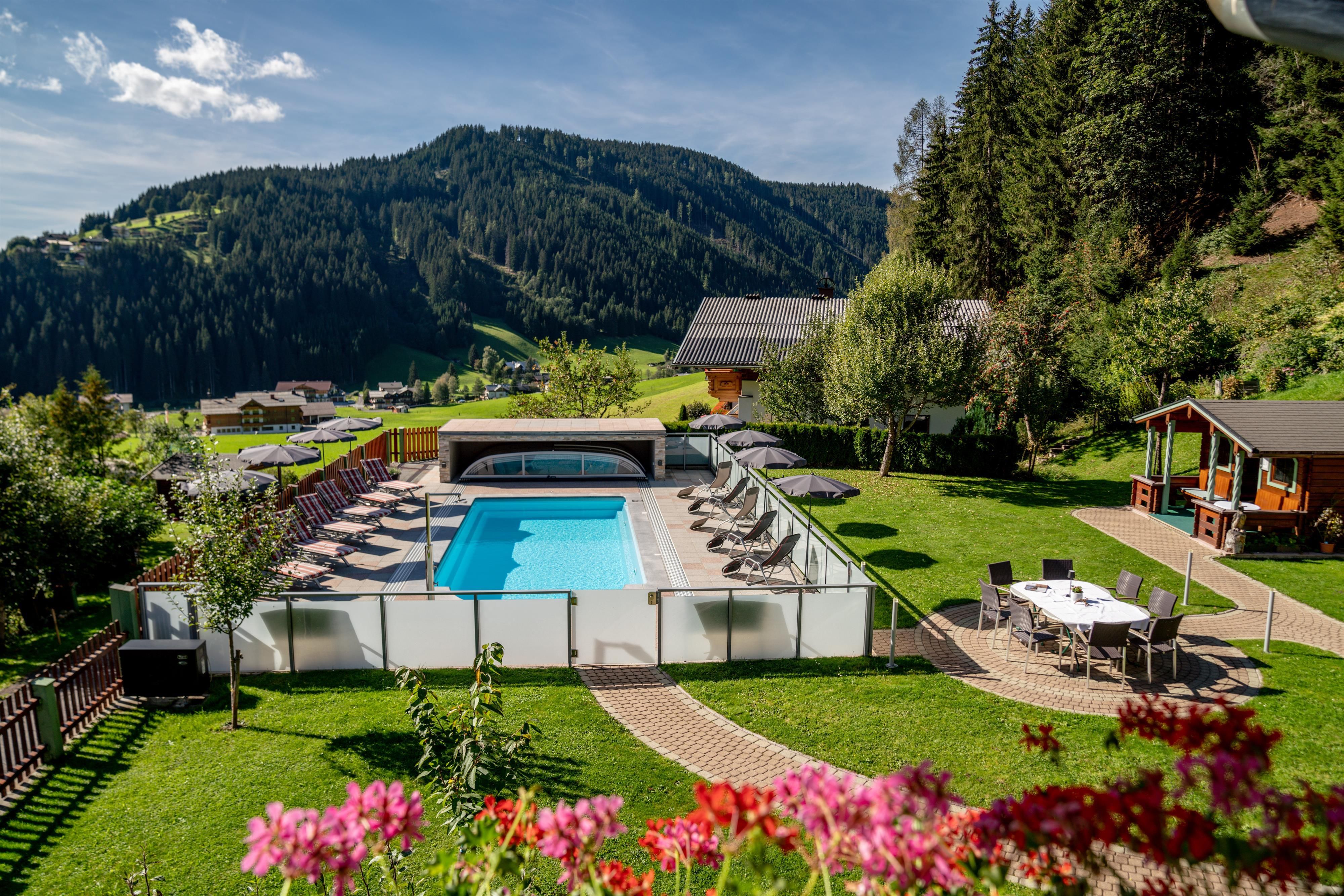 Im liebevoll gestaltenen Garten findet man genügend Platz für zahlreiche Urlaubsaktivitäten. Für jeden ist schon sein persönliches Wohlfühl-Plätzchen rund um das beheizte Freibad reserviert.