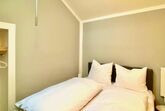 Eine kleine, gemütliche Wohnung mit zwei Schlafzimmern, Badezimmer und Küche mit Geschirrspüler und Mikrowelle.