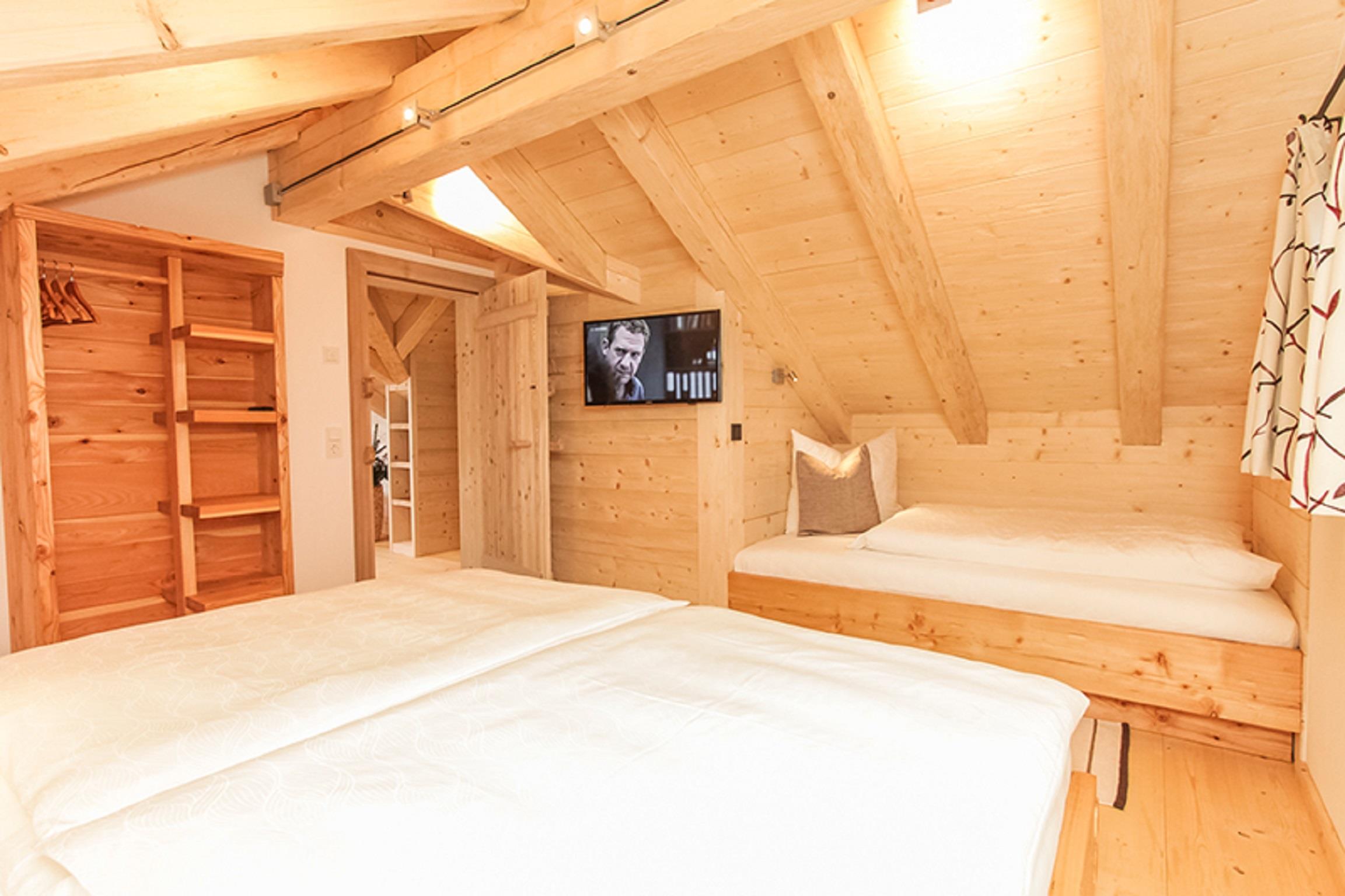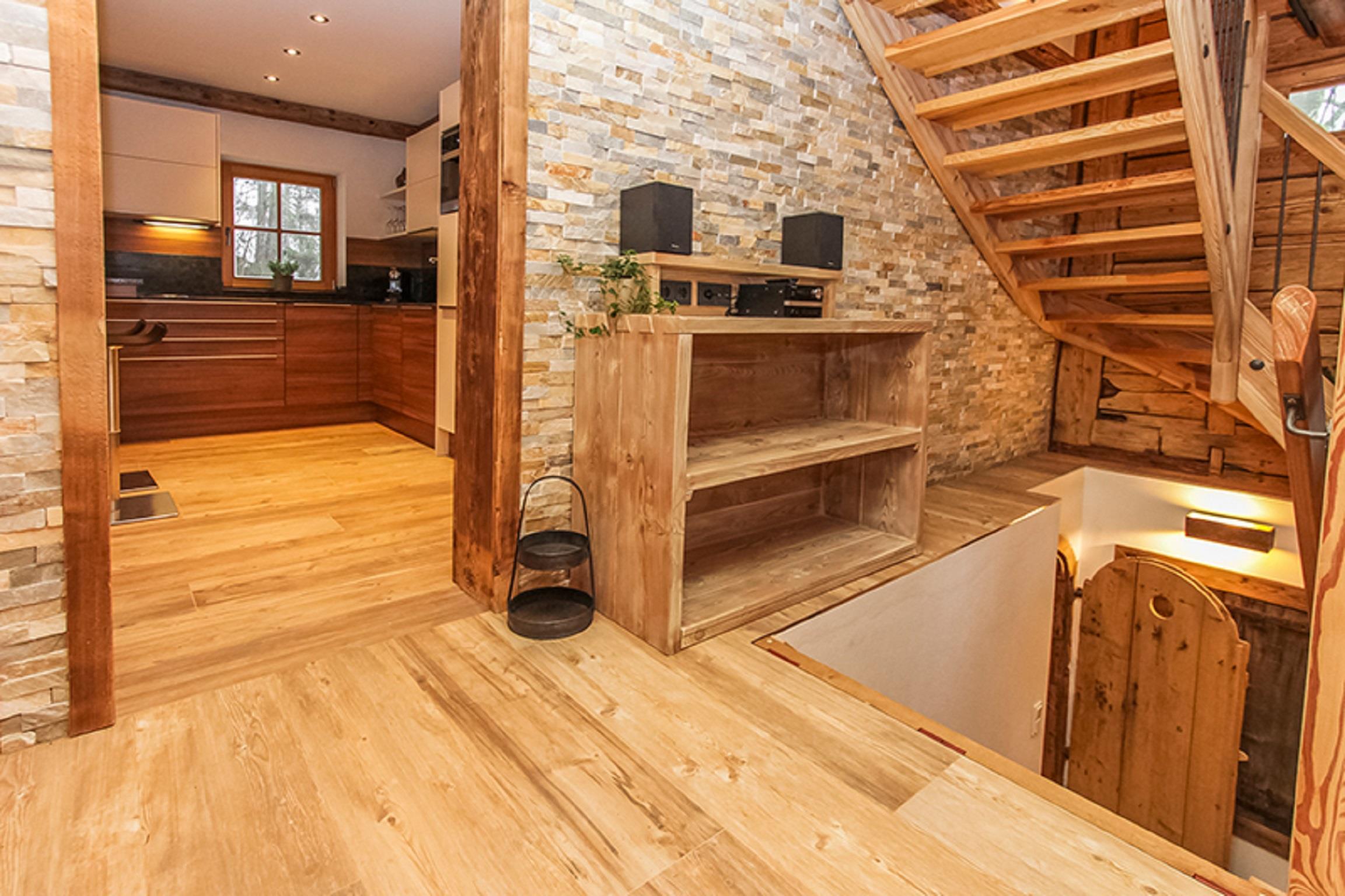 Das Chalet liegt sehr ruhig in leichter Hanglage. Es ist 110 m² groß , mit viel Altholz ausgestattet und edel eingerichtet. Im UG befindet sich ein großes, modernes Bad, mit Badewanne, Regendusche, doppeltem Waschtisch und separatem WC. Die Altholzsauna finden Sie ebenfalls im UG.