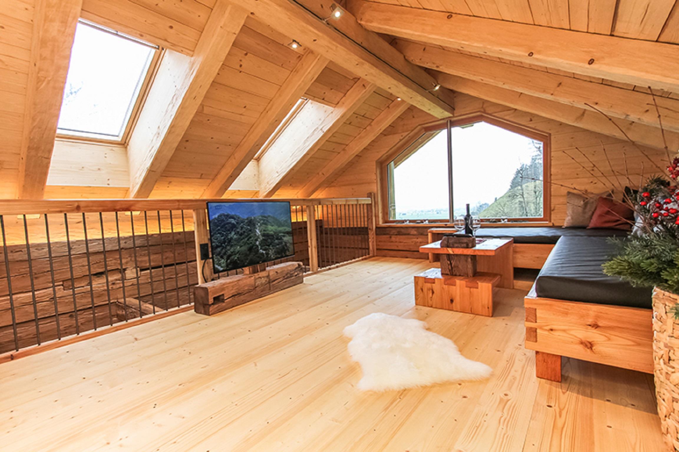 Über eine Treppe gelangen Sie zur Galerie mit großer Couch, Flat TV und Panoramafenster. Dort befindet sich das 2. Schlafzimmer und ein WC. W-Lan und Saalfelden Leogang Card inkl.!